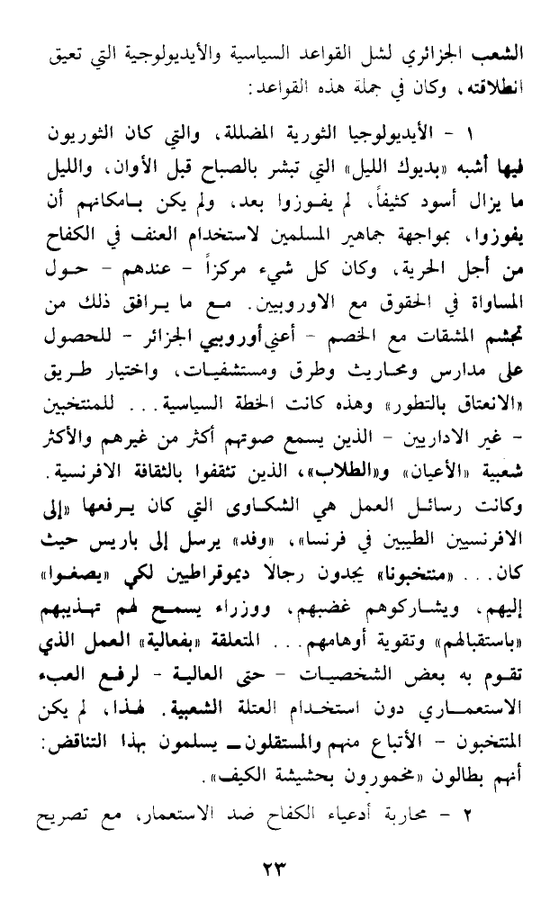 1 - الأيديولوجيا الثورية المضللة، والتي كان الثوريون فيها أشبه (بديوك الليل) التي تبشر بالصباح قبل الأوان، والليل ما يزال أسود كثيفا، لم يفوزوا بعد، ولم يكن بإمكانهم أن يفوزوا، بمواجهة جماهير المسلمين لاستخدام العنف في الكفاح من أجل الحرية، وكان كل شيء مركزا - عندهم - حول المساواة في الحقوق مع الأوروبيين. مع ما يرافق ذلك من تجشم المشقات مع الخصم - أعني أوروبيي الجزائر - للحصول على مدارس ومحاريث وطرق ومستشفيات، واختيار طريق (الانعتاق بالتطور) وهذه كانت الخطة السياسية ... للمنتخبين - غير الإداريين - الذين يسمع صوتهم أكثر من غيرهم والأكثر شعبية (الأعيان)، و (الطلاب)، الذين تثقفوا بالثقافة الإفرنسية.