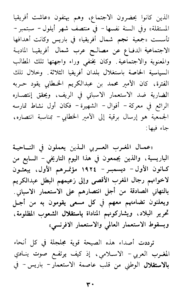 الذين كانوا يحضرون الاجتماع، وهم يهتفون (عاشت أفريقيا المستقلة) وفي السنة نفسها - في منتصف شهر أيلول - سبتمبر - تأسست (جمعية نجم شمال أفريقيا) في باريس وكانت أهدافها الاجتماعية الدفاع عن مصالح عرب شمال أفريقيا المادية والمعنوية والاجتماعية. وكان يختفي وراء واجهتها تلك المطالب السياسية الخاصة باستغلال بلدان أفريقيا الثلاثة. وخلال تلك الفترة، كان الأمير محمد بن عبد الكريم الخطابي يقود حربه الضارية ضد الاستعمار الإسباني في الريف، ويحقق إنتصاره الرائع في معركة - أفوال - الشهيرة - فكان أول نشاط تمارسه الجمعية هو إرسال برقية إلى الأمير الخطابي - بمناسبة انتصاره، جاء فيها: