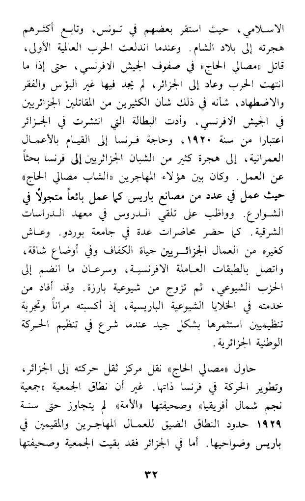 الإسلامي، حيث استقر بعضهم في تونس، وتابع أكثرهم هجرته إلى بلاد الشام. وعندما اندلعت الحرب العالمية الأولى، قاتل (مصالي الحاج). في صفوف الجيش الإفرنسي، حتى إذا ما انتهت الحرب وعاد إلى الجزائر، لم يجد فيها غير البؤس والفقر والاضطهاد، شأنه في ذلك شأن الكثيرين من المقاتلين الجزائريين في الجيش الإفرنسي، وأدت البطالة التي انتشرت في الجزائر اعتبارا من سنة 1920، وحاجة فرنسا إلى القيام بالأعمال العمرانية، إلى هجرة كثير من الشبان الجزائريين إلى فرنسا بحثا عن العمل. وكان بين هؤلاء المهاجرين (الشاب مصالي الحاج) حيث عمل في عدد من مصانع باريس كما عمل بائعا متجولا في الشوارع. وواظب على تلقي الدروس في معهد الدراسات الشرقية. كما حضر محاضرات عدة في جامعة بوردو. وعاش كغيره من العمال الجزائريين حياة الكفاف وفي أوضاع شاقة، واتصل بالطبقات العاملة الإفرنسية، وسرعان ما انضم إلى الحزب الشيوعي، ثم تزوج من شيوعية بارزة. وقد أفاد من خدمته في الخلايا الشيوعية الباريسية، إذ أكسبته مرانا وتجربة تنظيميين استثمرها بشكل جيد عندما شرع في تنظيم الحركة الوطنية الجزائرية.