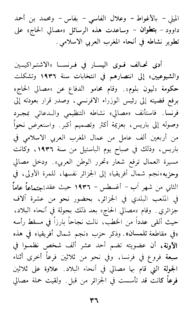 أدى تحالف قوى اليسار في فرنسا (الاشتراكيين والشيوعيين) إلى انتصارهم في انتخابات سنة 1936 وتشكلت, حكومة (ليون بلوم). وقام محامو الدفاع عن (مصالي الحاج) برفع قضيته إلى رئيس الوزراء الإفرنسي، وصدر قرار بعودته إلى فرنسا. فاستأنف (مصالي) نشاطه التنظيمي والدعائي بمجرد وصوله إلى باريس، بعزيمة أكثر وتصميم أكبر. واستعرض نحوا من أربعين ألف عامل من عمال المغرب العربي الإسلامي في باريس، وذلك في صباح يوم الباستيل من سنة 1936، وكانت مسيرة العمال ترفع شعار , (تحرر الوطن العربي). ودخل مصالي وحزبه (نجم شمال أفريقيا) إلى الجزائر نفسها، للمرة الأولى، في الثاني من شهر آب - أغسطس - 1936 حيث عقد اجتماعا عاما في الملعب البلدي في الجزائر، بحضور نحو من عشرة آلاف جزائري. وقام (مصالي الحاج)؛ بعد ذلك بجولة في أنحاء البلاد، حيث ألقى عددا من الخطب، نالت نجاحا بارزا في مسقط رأسه (في مقاطعة تلمسان). وذكر حزب (نجم شمال أفريقيا) في هذه الآونة، أن عضويته تضم أحد عشر ألف شخص نظموا في سبعة فروع في فرنسا، وفي نحو من ثلاثين فرعا أخرى أثناء الجولة التي قام بها مصالي في أنحاء البلاد. علاوة على ثلاثين فرعا كانت قد تأسست في الجزائر من قبل. ولقيت حملة مصالي