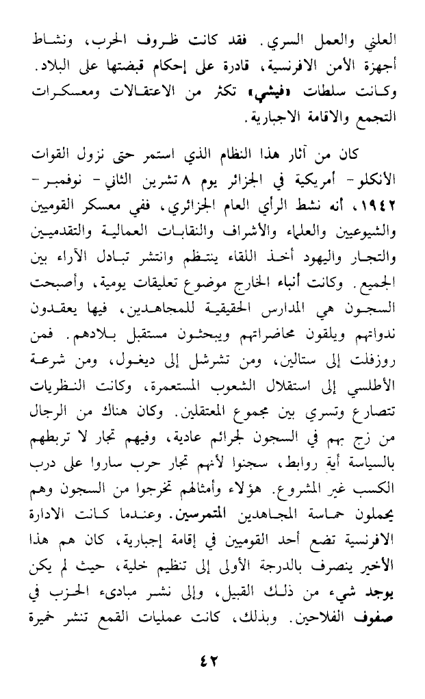 العلني والعمل السري. فقد كانت ظروف الحرب، ونشاط أجهزة الأمن الإفرنسية، قادرة على إحكام قبضتها على البلاد. وكانت سلطات (فيشي) تكثر من الاعتقالات ومعسكرات التجمع والإقامة الإجبارية.