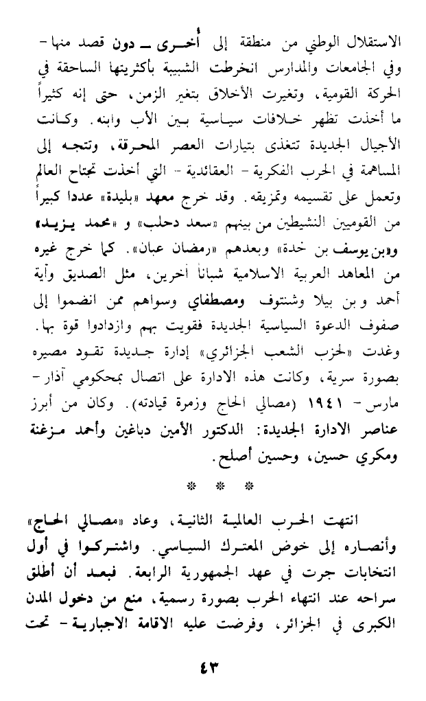 الاستقلال الوطني من منطقة إلى أخرى - دون قصد منها -وفي الجامعات والمدارس انخرطت الشبيبة بأكثريتها الساحقة في الحركة القومية، وتغيرت الأخلاق بتغير الزمن، حتى إنه كثيرا ما أخذت تظهر خلافات سياسية بين الأب وابنه. وكانت الأجيال الجديدة تتغنى بتيارات العصر المحرقة، وتتجه إلى المساهمة في الحرب الفكرية - العقائدية - التي أخذت تجتاح العالم وتعمل على تقسيمه وتمزيقه. وقد خرج معهد (بليدة) عددا كبيرا من القوميين النشيطين من بينهم (سعد دحلب) و (محمد يزيد) و (بن يوسف بن خدة) وبعدهم (رمضان عبان). كما خرج غيره من المعاهد العربية الإسلامية شبانا آخرين، مثل الصديق وآية أحمد وبن بيلا وشنتوف ومصطفاي وسواهم ممن انضموا إلى صفوف الدعوة السياسية الجديدة فقويت بهم وازدادوا قوة بها. وغدت (لحزب الشعب الجزائري)، إدارة جديدة تقود مصيره بصورة سرية، وكانت هذه الإدارة على اتصال بمحكومي آذار - مارس - 1941 (مصالي الحاج وزمرة قيادته). وكان من أبرز عناصر الإدارة الجديدة: الدكتور الأمين دباغين وأحمد مزغنة ومكري حسين، وحسين أصلح.