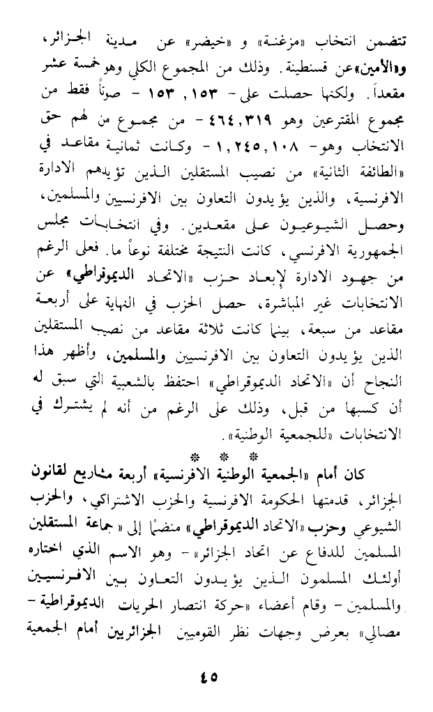 تتضمن انتخاب (مزغنة) و (خيضر) عن مدينة الجزائر، و (الأمين) عن قسنطينة. وذلك من المجموع الكلي وهو خمسة عشر مقعدا. ولكنها حصلت على - 153،153 - صوتا فقط من مجموع المقترعين وهو 464،319 - من مجموع من لهم حق الانتخاب وهو - 1،245،108 - وكانت ثمانية مقاعد في (الطائفة الثانية) من نصيب المستقلين الذين تؤيدهم الإدارة الإفرنسية، والذين يؤيدون التعاون بين الإفرنسيين والمسلمين، وحصل الشيوعيون على مقعدين. وفي انتخابات مجلس الجمهورية الإفرنسي، كانت النتيجة مختلفة نوعا ما. فعلى الرغم من جهود الإدارة لإبعاد حزب (الاتحاد الديمقراطي) عن الانتخابات غير المباشرة، حصل الحزب في النهاية على أربعة مقاعد من سبعة، بينما كانت ثلاثة مقاعد من نصيب المستقلين الذين يؤيدون التعاون بين الإفرنسيين والمسلمين، وأظهر هذا النجاح أن (الاتحاد الديموقراطي) احتفظ بالشعبية التي سبق له أن كسبها من قبل، وذلك على الرغم من أنه لم يشترك في الانتخابات (للجمعية الوطنية).
