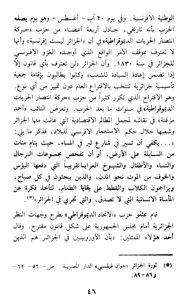 الوطنية الإفرنسية. وفي يوم 20 آب - أغسطس - وهو يوم يصفه الحزب بأنه تاريخي، جادل أربعة أعضاء من حزب (حركة انتصار الحريات الديموقراطية) في أن (الجزائر ليست إفرنسية) وأنها لا تعترف بموقف الأمر الواقع الذي أوجده الغزو الإفرنسي للجزائر في سنة 1830. وأن الجزائر (لن تعترف بأي قانون إلا إذا تضمن إعادة السيادة للشعب) وكانوا يطالبون بإقامة جمعية تأسيسية جزائرية تنتخب بالاقتراع العام دون تمييز من أي نوع. وهو الاقتراح الذي تكرر كثيرا من حزب (حركة انتصار الحريات الديموقراطية) في سنوات ما بعد الحرب. وتعرض النائب (أحمد مزغنة) في نقاشه لمجمل المظالم الاقتصادية التي عانت منها الجزائر وشعبها خلال حكم الاستعمار الإفرنسي للبلاد، فذكر ما يلي: (... يكفي أن تسير في شارع لير في المساء، حيث ينام مئات من السابلة على الأرض، أو أن تفحص مجموعات الرجال والنساء والأطفال والشيوخ العرايا تقريبا التي دفعها البؤس والخوف من الموت نحو المدن، والذين يبحثون في كل صباح، ويزاحمون الكلاب والقطط على بقايا الطعام، لتأخذ فكرة عن المأساة الإنسانية التي لا تصدق، والتي تجري في الجزائر) (*).