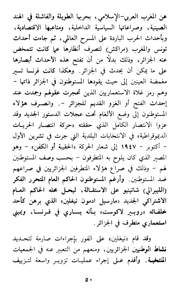 عن المغرب العربي - الإسلامي، بحربها الطويلة والفاشلة في الهند الصينية، وصراعاتها السياسية الداخلية، ومتاعبها الاقتصادية، وبأحداث الحرب الباردة على المسرح العالمي، ثم جاءت أحداث تونس والمغرب (مراكش) لتصرف أنظارها عما كانت تتمخض عنه الجزائر، وذلك بدلا من أن تفتح هذه الأحداث أبصارها على ما يمكن أن يحدث في الجزائر. وهكذا كانت فرنسا تسير مغمضة العينين إلى حيث يقودها المستوطنون في الجزائر ذاتها - وهم رمز غلاة الاستعماريين الذين تحجرت عقولهم وجمدت عند إحداث الفتح أو الغزو القديم للجزائر -. وانصرف هؤلاء المستوطنون إلى وضع الألغام تحت عجلات الدستور الجديد وقد عزوا الانتصار الكامل الذي حققته (حركة انتصار الحريات الديموقراطية) في الانتخابات البلدية التي جرت في تشرين الأول - أكتوبر - 1947 إلى شعار الحركة (الحقيبة أو الكفن) - وهو المصير الذي كان يلوح به المتطرفون - بحسب وصف المستوطنين لهم - وذلك في صراع هؤلاء المتطرفين الجزائريين في صراعهم ضد المستوطنين. وأرغم المستنوطنون الحاكم العام المتحرر الفكر (الليبرالي) شاتينيو على الاستقالة، ليحل محله الحاكم العام الاشتراكي الجديد (مارسيل أدمون نيغلين) الذي برهن كأحد خلفائه (روبير لاكوست) بأنه يساري في فرنسا، ويميني استعماري متطرف في الجزائر.
