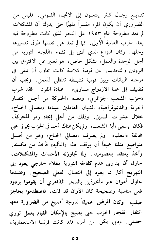 تتابع رجال كثر ينتمون إلى الاتجاه القومي. فليس من الضروري أن يكون المرء مفسرا ملهما حتى يدرك أن المشكلات لم تعد مطروحة عام 1953 على النحو الذي كانت مطروحة فيه بعد الحرب العالمية الأولى، كما لم تعد هي نفسها طرق تفسيرها وحلها. وكان النزاع الذي أدى إلى نشوء (اللجنة الثورية من أجل الوحدة والعمل) بشكل خاص، هو تعبير عن الافتراق بين الروتين والتجديد، بين قومية كلامية كانت تحاول أن تبقى في مرحلة البيانات وبين قومية نشيطة تتلظى للعمل. ويجب أن نضيف إلى هذا الازدواج مساوىء - عبادة الفرد - فقد شرب (حزب الشعب الجزائري) وبعده (الحركة من أجل انتصار الحرية والديموقراطية) الشبان العاملين عبادة (مصالي الحاج) خلال عشرات السنين، وذلك من أجل إيجاد رمز للحركة، فكان يسمى (أبا الشعب) ولم يكن هناك أحد في الحزب يجرؤ على مخالفة (المعلم). ولم يعرف (مصالي الحاج) وهو من أصل متواضع مثلنا جميعا أن يوقف هذا (التأليه) فأخذ من مكمنه، وأخذ يعتقد بمعصوميته. ولما تجاوزته الأحداث والمشكلات، حاول أن يداوي عدم كفاءته الثورية بطلاء خارجي يعود إلى التهريج أكثر مما يعود إلى النضال الفعلي الصحيح. وعندما حاول أعوان غير مأخوذين بالسحر الظاهري أن يقوموا بردود فعل مناسبة وصحيحة كان الأوان قد فات، فاصطدموا بحاجز صلب. وكان المرض عميقا لدرجة أصبح من الضرورة معها انتظار انفجار الحزب حتى يصبح بالإمكان القيام بعمل ثوري حقيقي. ومهما يكن من أمر، فقد كانت فرنسا الاستعمارية،
