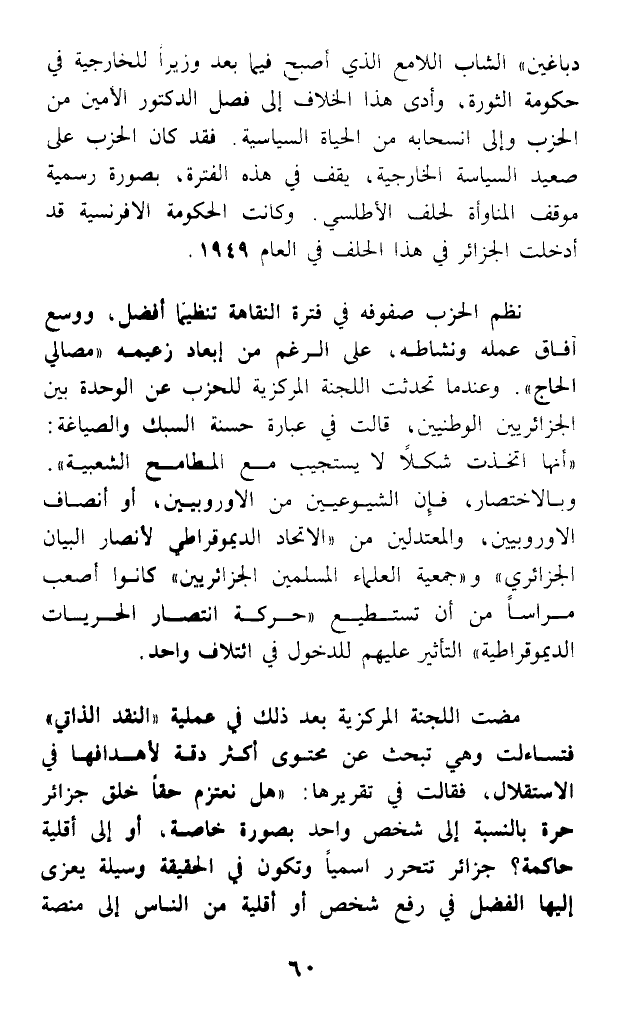 دباغين) الشاب اللامع الذي أصبح فيما بعد وزيرا للخارجية في حكومة الثورة، وأدى هذا الخلاف إلى فصل الدكتور الأمين من الحزب وإلى انسحابه من الحياة السياسية. فقد كان الحزب على صعيد السياسة الخارجية، يقف في هذه الفترة، بصورة رسمية موقف المناوأة لحلف الأطلسي. وكانت الحكومة الإفرنسية قد أدخلت الجزائر في هذا الحلف في العام 1949.