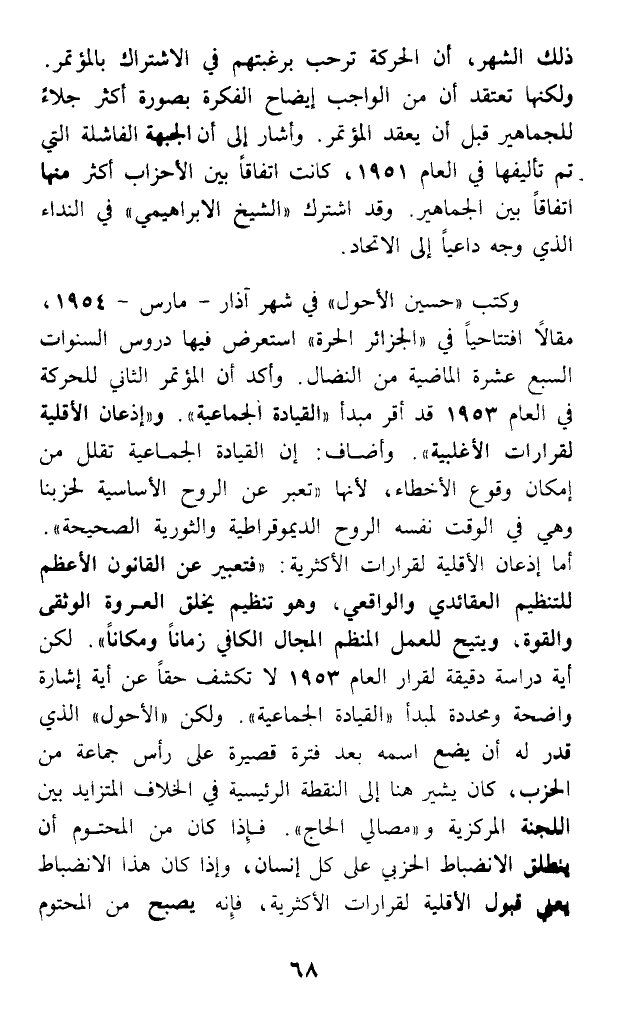 وكتب (حسين الأحول) في شهر آذار - مارس - 1954، مقالا افتتاحيا في (الجزائر الحرة) استعرض فيها دروس السنوات السبع عشرة الماضية من النضال. وأكد أن المؤتمر الثاني للحركة في العام 1953 قد أقر مبدأ (القيادة الجماعية). و (إذعان الأقلية لقرارات الأغلبية). وأضاف: إن القيادة الجماعية تقلل من إمكان وقوع الأخطاء، لأنها (تعبر عن الروح الأساسية لحزبنا وهي في الوقت نفسه الروح الديموقراطية والثورية الصحيحة). أما إذعان الأقلية لقرارات الأكثرية: (فتعبير عن القانون الأعظم للتنظيم العقائدي والواقعي، وهو تنظيم يخلق العروة الوثقى والقوة، ويتيح للعمل المنظم المجال الكافي زمانا ومكانا). لكن أية دراسة دقيقة لقرار العام 1953 لا تكشف حقا عن أية إشارة واضحة ومحددة لمبدأ (القيادة الجماعية). ولكن (الأحول) الذي قدر له أن يضع اسمه بعد فترة قصيرة على رأس جماعة من الحزب، كان يشير هنا إلى النقطة الرئيسية في الخلاف المتزايد بين اللجنة المركزية و (مصالي الحاج). فإذا كان من المحتوم أن ينطلق الانضباط الحزبي على كل إنسان، وإذا كان هذا الانضباط يعني قبول الأقلية لقرارات الأكثرية، فإنه يصبح من المحتوم
