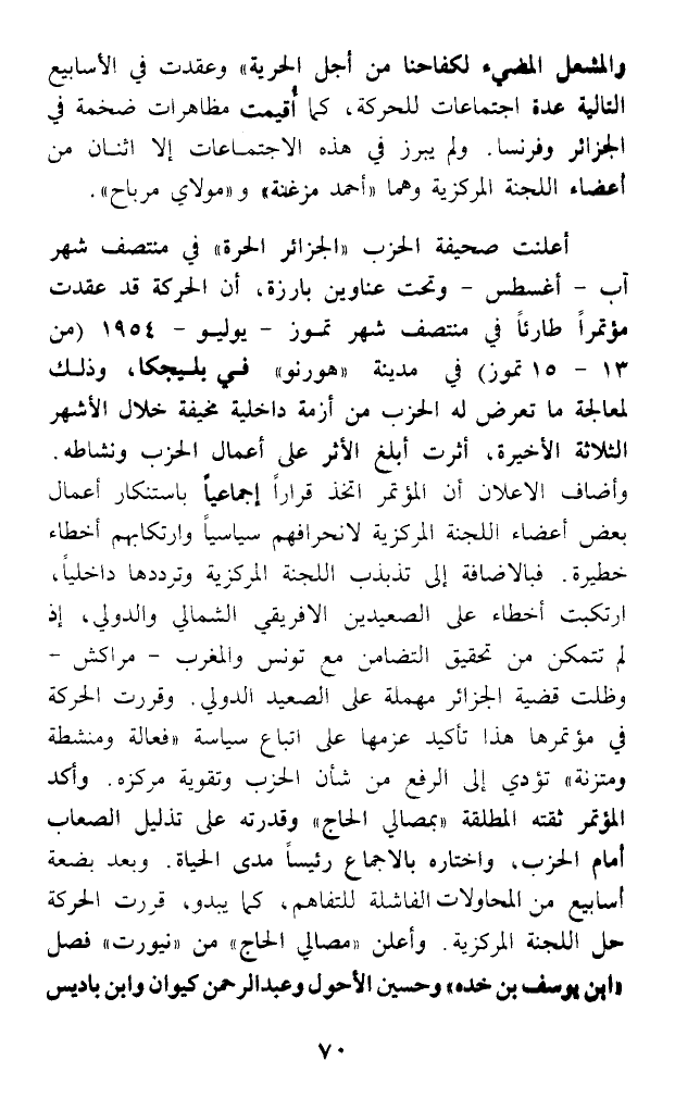 أعلنت صحيفة الحزب (الجزائر الحرة) في منتصف شهر آب - أغسطس - وتحت عناوين بارزة، أن الحركة قد عقدت مؤتمرا طارئا في منتصف شهر تموز - يويو - 1954 (من 13 - 15 تموز) في مدينة (هورنو) في بلجيكا، وذلك لمعالجة ما تعرض له الحزب من أزمة داخلية مخيفة خلال الأشهر الثلاثة الأخيرة، أثرت أبلغ الأثر على أعمال الحزب ونشاطه. وأضاف الإعلان أن المؤتمر اتخذ قرارا إجماعيا باستنكار أعمال بعض أعضاء اللجنة المركزية لاخرافهم سياسيا وارتكابهم أخطاء خطيرة. فبالإضافة إلى تذبذب اللجنة المركزية وترددها داخليا، ارتكبت أخطاء على الصعيدين الأفريقي الشمالي والدولي، إذ لم تتمكن من تحقيق التضامن مع تونس والمغرب - مراكش - وظلت قضية الجزائر مهملة على الصعيد الدولي. وقررت الحركة في مؤتمرها هذا تأكيد عزمها على اتباع سياسة (فعالة ومنشطة ومتزنة) تؤدي إلى الرفع من شأن الحزب وتقوية مركزه. وأكد المؤتمر ثقته المطلقة (بمصالي الحاج) وقدرته على تذليل الصعاب أمام الحزب، واختاره بالإجماع رئيسا مدى الحياة. وبعد بضعة أسابيع من المحاولات الفاشلة للتفاهم، كما يبدو، قررت الحركة حل اللجنة المركزية. وأعلن (مصالي الحاج) من (نيورت) فصل (ابن يوسف بن خده) وحسين الأحول وعبد الرحمن كيوان وابن باديس