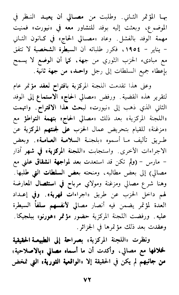 بها المؤتمر الثاني. وطلبت من مصالي أن يعيد النظر في الموضوع، وبعثت إليه بوفد للتشاور معه في (نيورت) فمنيت مهمة الوفد بالفشل. وعاد (مصالي الحاج) في كانون الثاني - يناير - 1954، فكرر طلباته أن السيطرة الشخصية لا تتفق مع مبادىء الحزب الثوري من جهة، كما أن الوضع لا يسمح بإعطاء جميع السلطات إلى رجل واحد، من جهة ثانية.