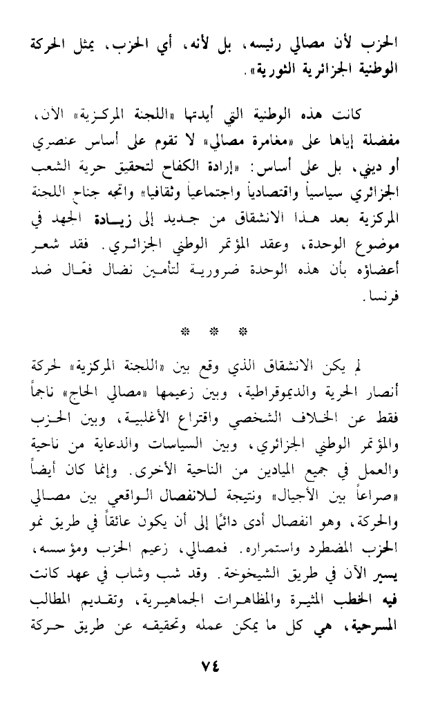 الحزب لأن مصالي رئيسه؛ بل لأنه، أي الحزب، يمثل الحركة الوطنية الجزائرية الثورية).