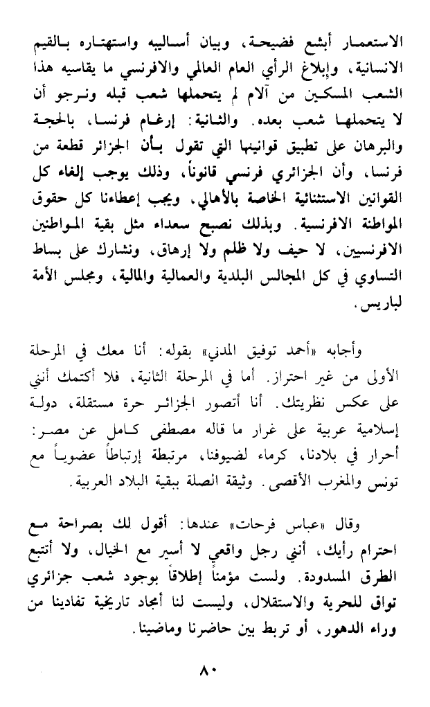 وقال (عباس فرحات) عندها: أقول لك بصراحة مع احترام رأيك، أنني رجل واقعي لا أسير مع الخيال، ولا أتتبع الطرق المسدودة ولست مؤمنا إطلاقا بوجود شعب جزائري تواق للحرية والاستقلال، وليست لنا أمجاد تاريخية تفادينا من وراء الدهور، أو تربط بين حاضرنا وماضينا.