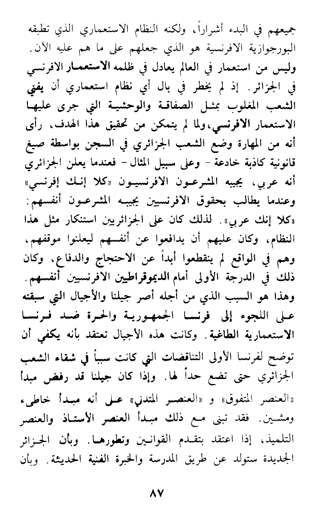 جميعهم في البدء أشرارا، ولكنه النظام الاستعماري الذي تطبقه البورجوازية الإفرنسية هو الذي جعلهم على ما هم عليه الآن. وليس من استعمار في العالم يعادل في ظلمه الاستعمار الإفرنسي في الجزائر. إذ لم يخطر في بال أي نظام استعماري أن يفني الشعب المغلوب بمثل الصفاقة والوحشية التي جرى عليها الاستعمار الإفرنسي، ولما لم يتمكن من تحقيق هذا الهدف، رأى أنه من المهارة وضع الشعب الجزائري في السجن بواسطة صيغ قانونية كاذبة خادعة - وعلى سبيل المثال - فعندما يعلن الجزائري أنه عربي، يجيبه المشرعون الإفرنسيون (كلا إنك إفرنسي) وعندما يطالب بحقوق الإفرنسيين يجيبه المشرعون أنفسهم: (كلا إنك عربي). لذلك كان على الجزائريين استنكار مثل هذا النظام، وكان عليهم أن يدافعوا عن أنفسهم ليعلنوا موقفهم، وهم في الواقع لم ينقطعوا أبدا عن الاحتجاج والدفاع، وكان ذلك في الدرجة الأولى أمام الديموقراطيين الإفرنسيين أنفسهم. وهذا هو السبب الذي من أجله أصر جيلنا والأجيال التي سبقته على اللجوء إلى فرنسا الجمهورية والحرة ضد فرنسا الاستعمارية الطاغية. وكانت هذه الأجيال تعتقد بأنه يكفي أن توضح لفرنسا الأولى التناقضات التي كانت سببا في شقاء الشعب الجزائري حتى تضع حدا لها. وإذا كان جيلنا قد رفض مبدأ (العنصر المتفوق) و (العنصر المتدني) على أنه مبدأ خاطىء ومشين. فقد تبنى مع ذلك مبدأ العنصر الأستاذ والعنصر التلميذ، إذا اعتقد بتقدم القوانين وتطورها. وبأن الجزائر الجديدة ستولد عن طريق المدرسة والخبرة الفنية الحديثة. وبأن