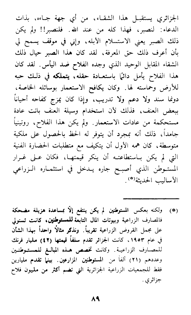 الجزائري يستقبل هذا الشقاء، من أي جهة جاءه، بذات الدعاء: لنصبر، فهذا كله من عند الله. فلنصبر!! ولم يكن ذلك الصبر يعني الاستسلام الأبله، وإني في موقف يسمح لي بأن أعرف ذلك حق المعرفة، لقد كان هذا الصبر حيال ذلك الشقاء المقابل الوحيد الذي وجده الفلاح ضد اليأس. لقد كان هذا الفلاح يأمل دائما باستعادة حقله، يتملكه في ذلك حبه للأرض وحماسته لها. وكان يكافح الاستعمار بوسائله الخاصة، دونما سند ولا دعم ولا تدريب، وإذا كان يمزج كفاحه أحيانا ببعض العنف، فذلك لأن استخدام وسيلة العنف باتت عادة مستحكمة من عادات الاستعمار. ولم يكن هذا الفلاح، روتينيا جامدا، ذلك أنه بمجرد أن يتوفر له الحظ بالحصول على ملكية متوسطة، كان همه الأول أن يتكيف مع متطلبات الحضارة الفنية التي لم يكن باستطاعته أن ينكر قيمتها، فكان على غرار المستوطن الذي أصبح جاره يدخل في استثماره الزراعي الأساليب الحديثة (*).