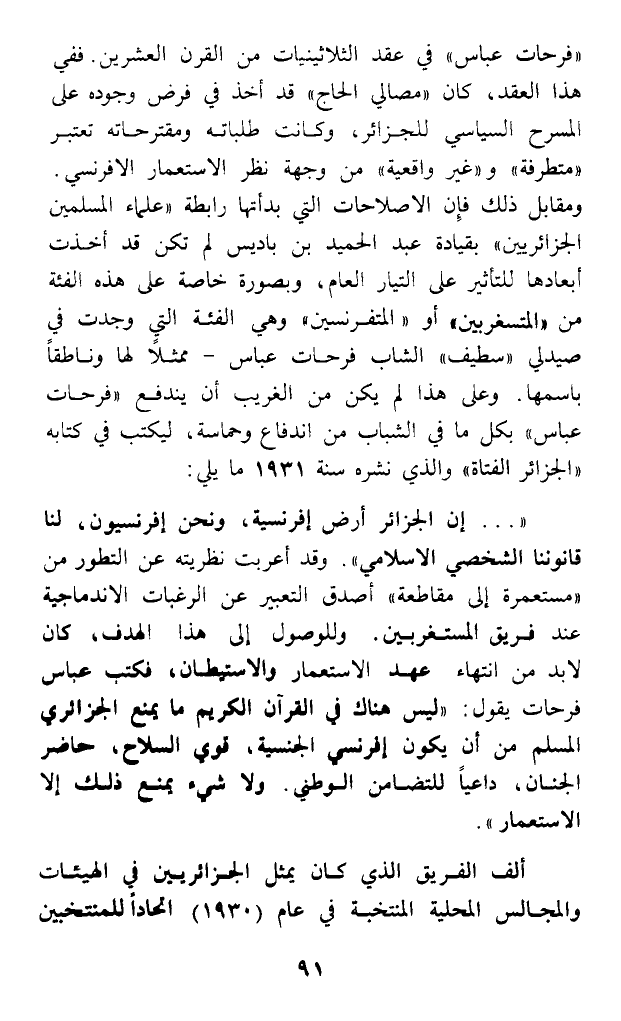 (فرحات عباس) في عقد الثلاثينيات من القرن العشرين. ففي هذا العقد، كان (مصالي الحاج) قد أخذ في فرض وجوده على المسرح السياسي للجزائر، وكانت طلباته ومقترحاته تعتبر (متطرفة) و (غير واقعية) من وجهة نظر الاستعمار الإفرنسي. ومقابل ذلك فإن الإصلاحات التي بدأب رابطة (علماء المسلمين الجزائريين) بقيادة عبد الحميد بن باديس لم تكن قد أخذت أبعادها للتأثير على التيار العام، وبصورة خاصة على هذه الفئة من (المستغربين) أو (المتفرنسين) وهي الفئة التي وجدت في صيدلي (سطيف) الشاب فرحات عباس - ممثلا لها وناطقا باسمها. وعلى هذا لم يكن من الغريب أن يندفع (فرحات عباس) بكل ما في الشباب من اندفاع وحماسة، ليكتب في كتابه (الجزائر الفتاة) والذي نشره سنة 1931 ما يلي: