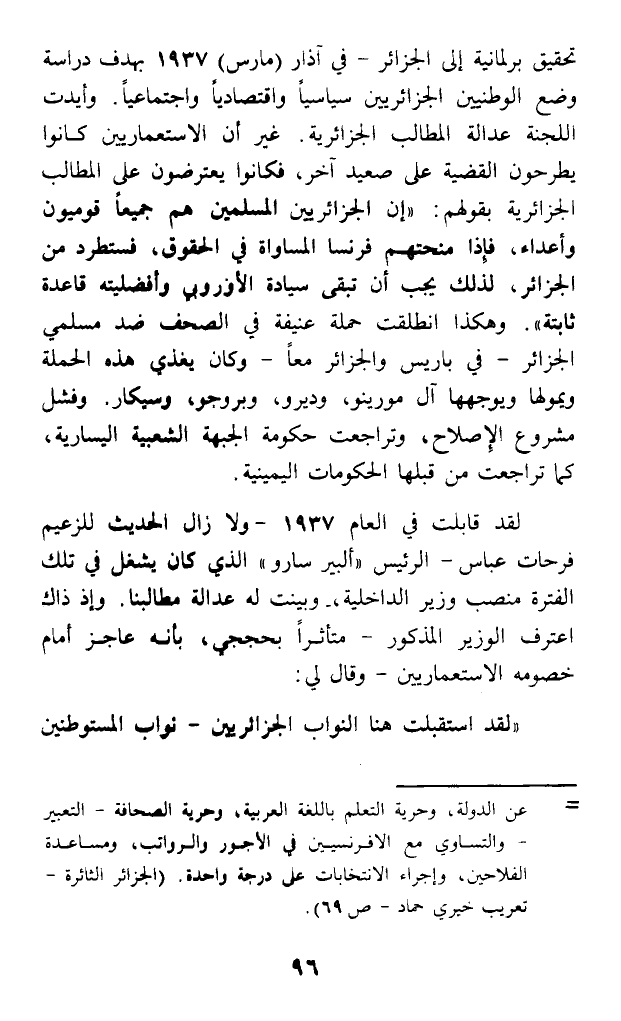 تحقيق برلمانية إلى الجزائر - في آذار (مارس) 1937 بهدف دراسة وضع الوطنيين الجزائريين سياسيا واقتصاديا واجتماعيا. وأيدت اللجنة عدالة المطالب الجزائرية. غير أن الاستعماريين كانوا يطرحون القضية على صعيد آخر، فكانوا يعترضون على المطالب الجزائرية بقولهم: (إن الجزائريين المسلمين هم جميعا قوميون وأعداء، فإذا منحتهم فرنسا المساواة في الحقوق، فستطرد من الجزائر، لذلك يجب أن تبقى سيادة الأوروبي وأفضليته قاعدة ثابتة). وهكذا انطلقت حملة عنيفة في الصحف ضد مسلمي الجزائر - في باريس والجزائر معا - وكان يغذي هذه الحملة ويمولها ويوجهها آل مورينو، وديرو، وبروجو، وسيكار - وفشل مشروع الإصلاح، وتراجعت حكومة الجبهة الشعبية اليسارية، كما تراجعت من قبلها الحكومات اليمينية.
