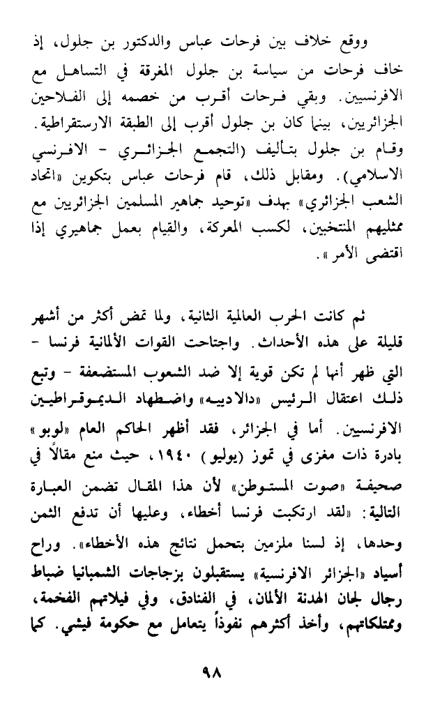ثم كانت الحرب العالمية الثانية، ولما تمض أكثر من أشهر قليلة على هذه الأحداث. واجتاحت القوات الألمانية فرنسا - التي ظهر أنها لم تكن قوية إلا ضد الشعوب المستضعفة - وتبع ذلك اعتقال الرئيس (دالادييه) واضطهاد الديموقراطيين الإفرنسيين. أما في الجزائر، فقد أظهر الحاكم العام (لوبو) بادرة ذات مغزى في تموز (يوليو) 1940، حيث منع مقالا في صحيفة (صوت المستوطن) لأن هذا المقال تضمن العبارة التالية: (لقد ارتكبت فرنسا أخطاء، وعليها أن تدفع الثمن وحدها، إذ لسنا ملزمين بتحمل نتائج هذه الأخطاء). وراح أسياد (الجزائر الإفرنسية) يستقبلون بزجاجات الشمبانيا ضباط رجال لجان الهدنة الألمان، في الفنادق، وفي فيلاتهم الفخمة، وممتلكاتهم، وأخذ أكثرهم نفوذا يتعامل مع حكومة فيشي. كما