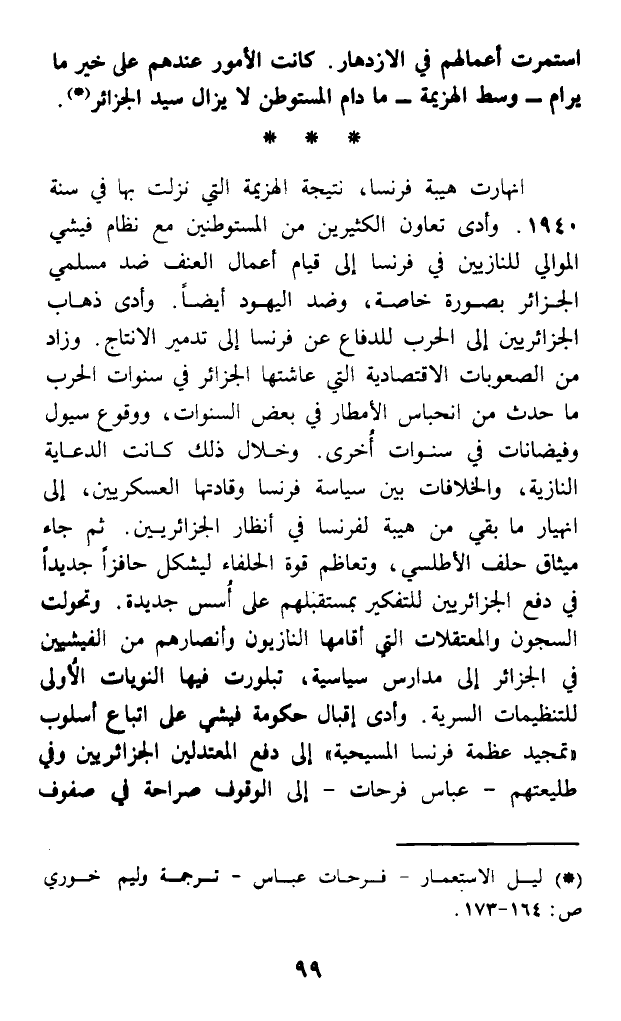 (*) ليل الاستعمار - فرحات عباس - ترجمة وليم خوري ص: 164 - 173.