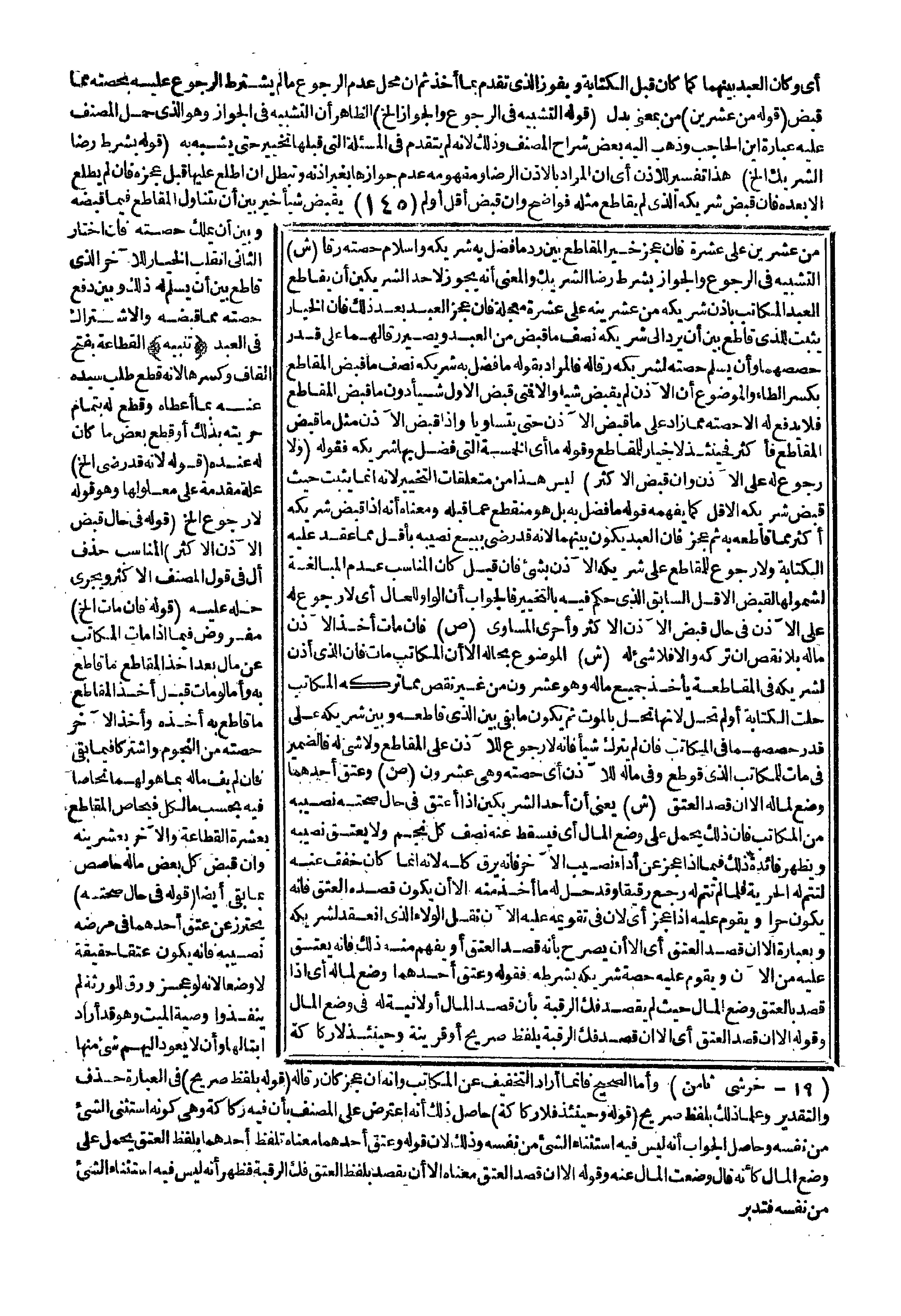 ـــــــــــــــــــــــــــــQأَيْ وَكَانَ الْعَبْدُ بَيْنَهُمَا كَمَا كَانَ قَبْلَ الْكِتَابَةِ وَيَفُوزُ الَّذِي تَقَدَّمَ بِمَا أَخَذَ ثُمَّ إنَّ مَحَلَّ عَدَمِ الرُّجُوعِ مَا لَمْ يَشْتَرِطْ الرُّجُوعَ عَلَيْهِ بِحِصَّتِهِ مِمَّا قَبَضَ (قَوْلُهُ مِنْ عِشْرِينَ) مِنْ بِمَعْنَى بَدَلَ (قَوْلُهُ التَّشْبِيهُ فِي الرُّجُوعِ وَالْجَوَازِ إلَخْ) الظَّاهِرُ أَنَّ التَّشْبِيهَ فِي الْجَوَازِ وَهُوَ الَّذِي حَمَلَ الْمُصَنِّفُ عَلَيْهِ عِبَارَةَ ابْنِ الْحَاجِبِ وَذَهَبَ إلَيْهِ بَعْضُ شُرَّاحِ الْمُصَنِّفِ وَذَلِكَ؛ لِأَنَّهُ؛ لَمْ يَتَقَدَّمْ فِي الْمَسْأَلَةِ الَّتِي قَبْلَهَا تَخْيِيرٌ حَتَّى يُشَبِّهَ بِهِ (قَوْلُهُ بِشَرْطِ رِضَا الشَّرِيكِ إلَخْ) هَذَا تَفْسِيرٌ لِلْإِذْنِ أَيْ أَنَّ الْمُرَادَ بِالْإِذْنِ الرِّضَا وَمَفْهُومُهُ عَدَمُ جَوَازِهَا بِغَيْرِ إذْنِهِ وَتَبْطُلُ إنْ اطَّلَعَ عَلَيْهَا قَبْلَ عَجْزِهِ فَإِنْ لَمْ يَطَّلِعْ إلَّا بَعْدَهُ فَإِنْ قَبَضَ شَرِيكَهُ الَّذِي لَمْ يُقَاطِعْ مِثْلَهُ فَوَاضِحٌ وَإِنْ قَبَضَ أَقَلَّ أَوْ لَمْ يَقْبِضْ شَيْئًا خُيِّرَ بَيْنَ أَنْ يَتَنَاوَلَ الْمُقَاطِعُ فِيمَا قَبَضَهُ وَبَيْنَ أَنْ يَمْلِكَ حِصَّتَهُ فَإِنْ اخْتَارَ الثَّانِيَ انْقَلَبَ الْخِيَارُ لِلْآخَرِ الَّذِي قَاطَعَ بَيْنَ أَنْ يُسَلِّمَ لَهُ ذَلِكَ وَبَيْنَ دَفْعِ حِصَّتِهِ مِمَّا قَبَضَهُ وَالِاشْتِرَاكِ فِي الْعَبْدِ (تَنْبِيهٌ) الْقَطَاعَةُ بِفَتْحِ الْقَافِ وَكَسْرِهَا؛ لِأَنَّهُ؛ قَطَعَ طَلَبَ سَيِّدِهِ عَنْهُ بِمَا أَعْطَاهُ وَقَطَعَ لَهُ بِتَمَامِ حُرِّيَّتِهِ بِذَلِكَ أَوْ قَطَعَ بَعْضَ مَا كَانَ لَهُ عِنْدَهُ (قَوْلُهُ: لِأَنَّهُ؛ قَدْ رَضِيَ إلَخْ) عِلَّةٌ مُقَدَّمَةٌ عَلَى مَعْلُولِهَا وَهُوَ قَوْلُهُ لَا رُجُوعَ إلَخْ (قَوْلُهُ فِي حَالِ قَبْضِ الْآذِنِ الْأَكْثَرَ) الْمُنَاسِبُ حَذْفُ أَلْ فِي قَوْلِ الْمُصَنِّفِ الْأَكْثَرَ وَيَجْرِي حِلَّهُ عَلَيْهِ (قَوْلُهُ فَإِنْ مَاتَ إلَخْ) مَفْرُوضٌ فِيمَا إذَا مَاتَ الْمُكَاتَبُ عَنْ مَالٍ بَعْدَ أَخْذِ الْمُقَاطِعِ مَا قَاطَعَ بِهِ وَأَمَّا لَوْ مَاتَ قَبْلَ أَخْذِ الْمُقَاطِعِ مَا قَاطَعَ بِهِ أَخَذَهُ وَأَخَذَ الْآخَرُ حِصَّتَهُ مِنْ النُّجُومِ وَاشْتَرَكَا فِيمَا بَقِيَ فَإِنْ لَمْ يَفِ مَالُهُ بِمَا هُوَ لَهُمَا تَحَاصَّا فِيهِ بِحَسَبِ مَا لِكُلٍّ فَيُحَاصُّ الْمُقَاطِعُ بِعَشَرَةِ الْقَطَاعَةِ وَالْآخَرُ بِعِشْرِينِهِ وَإِنْ قَبَضَ كُلٌّ بَعْضَ مَالِهِ حَاصَصَ بِمَا بَقِيَ أَيْضًا