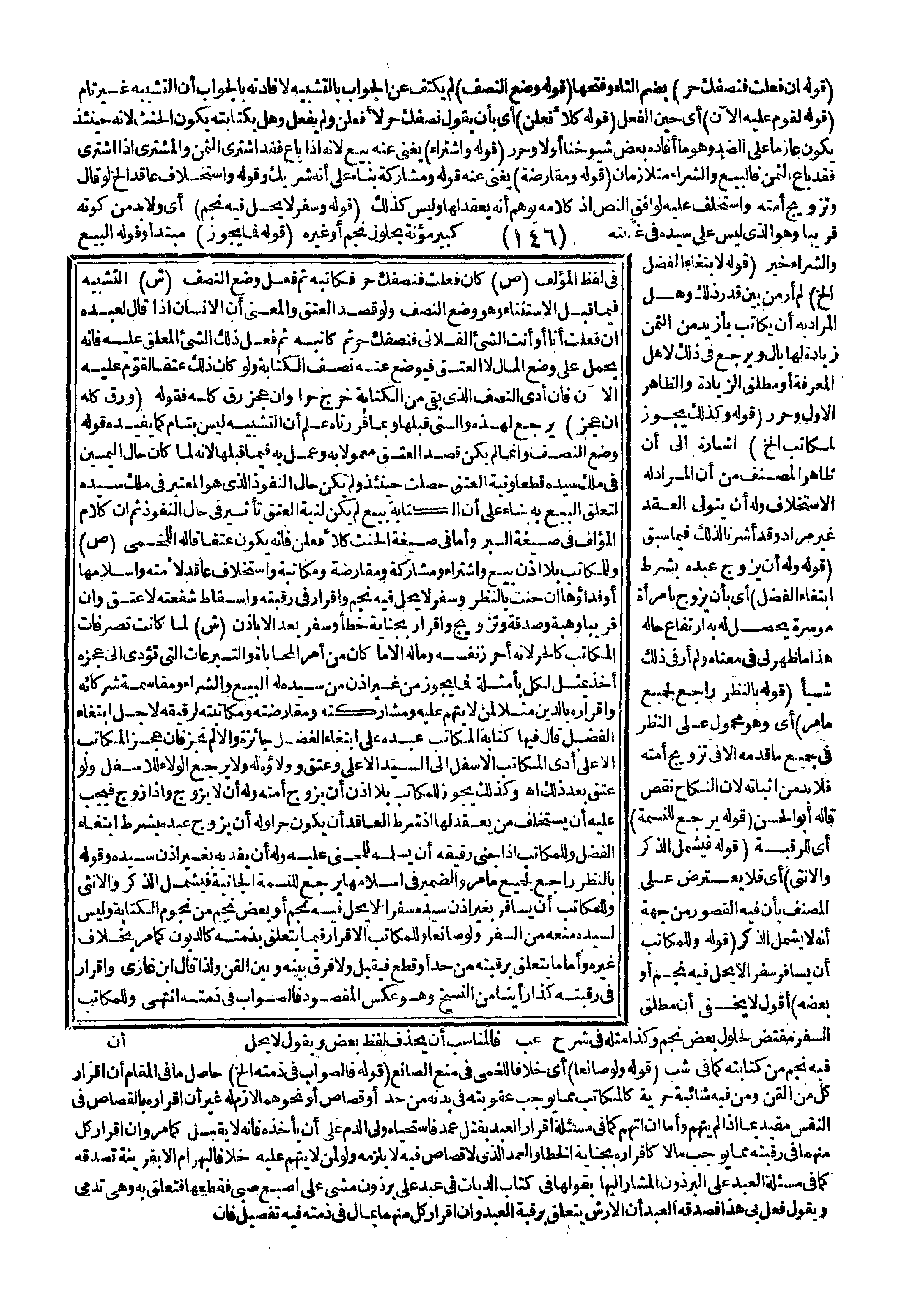 فِي لَفْظِ الْمُؤَلِّفِ (ص) كَإِنْ فَعَلْت فَنِصْفُك حُرٌّ فَكَاتَبَهُ ثُمَّ فَعَلَ وُضِعَ النِّصْفُ (ش) التَّشْبِيهُ فِيمَا قَبْلَ الِاسْتِثْنَاءِ وَهُوَ وَضْعُ النِّصْفِ وَلَوْ قَصَدَ الْعِتْقَ، وَالْمَعْنَى أَنَّ الْإِنْسَانَ إذَا قَالَ لِعَبْدِهِ إنْ فَعَلْت أَنَا أَوْ أَنْتَ الشَّيْءَ الْفُلَانِيَّ فَنِصْفُك حُرٌّ ثُمَّ كَاتَبَهُ ثُمَّ فَعَلَ ذَلِكَ الشَّيْءَ الْمُعَلَّقَ عَلَيْهِ فَإِنَّهُ يُحْمَلُ عَلَى وَضْعِ الْمَالِ لَا الْعِتْقِ فَيُوضَعُ عَنْهُ نِصْفُ الْكِتَابَةِ وَلَوْ كَانَ ذَلِكَ عِتْقًا لَقُوِّمَ عَلَيْهِ الْآنَ فَإِنْ أَدَّى النِّصْفَ الَّذِي بَقِيَ مِنْ الْكِتَابَةِ خَرَجَ حُرًّا وَإِنْ عَجَزَ رَقَّ كُلُّهُ فَقَوْلُهُ (وَرَقَّ كُلُّهُ إنْ عَجَزَ) يَرْجِعُ لِهَذِهِ وَاَلَّتِي قَبْلَهَا وَبِمَا قَرَّرْنَاهُ عُلِمَ أَنَّ التَّشْبِيهَ لَيْسَ بِتَامٍّ كَمَا يُفِيدُهُ قَوْلُهُ وَضَعَ النِّصْفَ وَإِنَّمَا لَمْ يَكُنْ قَصْدُ الْعِتْقِ مَعْمُولًا بِهِ وَعُمِلَ بِهِ فِيمَا قَبْلَهَا؛ لِأَنَّهُ لَمَّا كَانَ حَالُ الْيَمِينِ فِي مِلْكِ سَيِّدِهِ قَطَعَا وَنِيَّةُ الْعِتْقِ حَصَلَتْ حِينَئِذٍ وَلَمْ يَكُنْ حَالُ النُّفُوذِ الَّذِي هُوَ الْمُعْتَبَرُ فِي مِلْكِ سَيِّدِهِ لِتَعَلُّقِ الْبَيْعِ بِهِ بِنَاءً عَلَى أَنَّ الْكِتَابَةَ بَيْعٌ لَمْ يَكُنْ لِنِيَّةِ الْعِتْقِ تَأْثِيرٌ فِي حَالِ النُّفُوذِ إنَّ كَلَامَ الْمُؤَلِّفِ فِي صِيغَةِ الْبِرِّ وَأَمَّا فِي صِيغَةِ الْحِنْثِ كَلَأَفْعَلَنَّ فَإِنَّهُ يَكُونُ عِتْقًا قَالَهُ اللَّخْمِيُّ