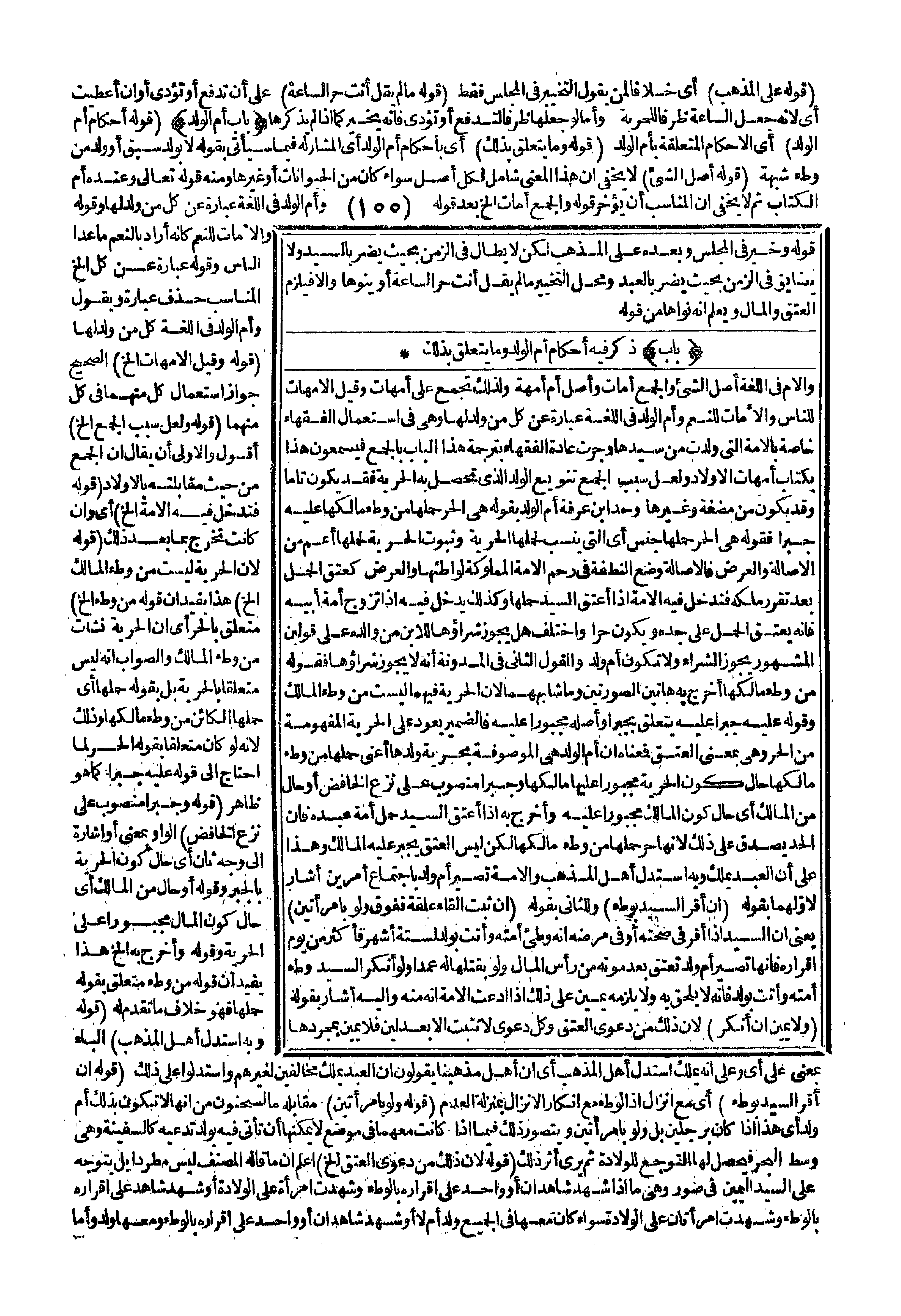 (بَابٌ) ذُكِرَ فِيهِ أَحْكَامُ أُمِّ الْوَلَدِ وَمَا يَتَعَلَّقُ بِذَلِكَ وَالْأُمُّ فِي اللُّغَةِ أَصْلُ الشَّيْءِ وَالْجَمْعُ أُمَّاتٌ وَأَصْلُ أُمٍّ أُمَّهَةٌ وَلِذَلِكَ تُجْمَعُ عَلَى أُمَّهَاتٍ وَقِيلَ الْأُمَّهَاتُ لِلنَّاسِ وَالْأُمَّاتُ لِلنَّعَمِ وَأُمُّ الْوَلَدِ فِي اللُّغَةِ عِبَارَةٌ عَنْ كُلِّ مَنْ وُلِدَ لَهَا وَهِيَ فِي اسْتِعْمَالِ الْفُقَهَاءِ خَاصَّةٌ بِالْأَمَةِ الَّتِي وَلَدَتْ مِنْ سَيِّدِهَا وَجَرَتْ عَادَةُ الْفُقَهَاءِ بِتَرْجَمَةِ هَذَا الْبَابِ بِالْجَمْعِ فَيُسَمُّونَ هَذَا بِكِتَابِ أُمَّهَاتِ الْأَوْلَادِ وَلَعَلَّ سَبَبَ الْجَمْعِ تَنْوِيعُ الْوَلَدِ الَّذِي تَحْصُلُ بِهِ الْحُرِّيَّةُ فَقَدْ يَكُونُ تَامًّا وَقَدْ يَكُونُ مِنْ مُضْغَةٍ وَغَيْرِهَا وَحَدَّ ابْنُ عَرَفَةَ أُمَّ الْوَلَدِ بِقَوْلِهِ هِيَ الْحُرُّ حَمْلُهَا مِنْ وَطْءِ مَالِكِهَا عَلَيْهِ جَبْرًا فَقَوْلُهُ هِيَ الْحُرُّ حَمْلُهَا جِنْسٌ أَيْ الَّتِي يُنْسَبُ لِحَمْلِهَا الْحُرِّيَّةُ وَثُبُوتُ الْحُرِّيَّةِ لِحَمْلِهَا أَعَمُّ مِنْ الْأَصَالَةِ وَالْعَرْضِ فَالْأَصَالَةُ وَضْعُ النُّطْفَةِ فِي رَحِمِ الْأَمَةِ الْمَمْلُوكَةِ لِوَاطِئِهَا وَالْعَرْضُ كَعِتْقِ الْحَمْلِ بَعْدَ تَقَرُّرِ مِلْكِهِ فَتَدْخُلُ فِيهِ الْأَمَةُ إذَا أَعْتَقَ السَّيِّدُ حَمْلَهَا وَكَذَلِكَ يَدْخُلُ فِيهِ إذَا تَزَوَّجَ أَمَةَ أَبِيهِ فَإِنَّهُ يَعْتِقُ الْحَمْلُ عَلَى جَدِّهِ وَيَكُونُ حُرًّا وَاخْتَلَفَ هَلْ يَجُوزُ شِرَاؤُهَا لِلِابْنِ مِنْ وَالِدِهِ عَلَى قَوْلَيْنِ الْمَشْهُورُ يَجُوزُ الشِّرَاءُ وَلَا تَكُونُ أُمَّ وَلَدٍ وَالْقَوْلُ الثَّانِي فِي الْمُدَوَّنَةِ أَنَّهُ لَا يَجُوزُ شِرَاؤُهَا فَقَوْلُهُ مِنْ وَطْءِ مَالِكِهَا أَخْرَجَ بِهِ هَاتَيْنِ الصُّورَتَيْنِ وَمَا شَابَهَهُمَا لِأَنَّ الْحُرِّيَّةَ فِيهَا لَيْسَتْ مِنْ وَطْءِ الْمَالِكِ وَقَوْلُهُ عَلَيْهِ جَبْرًا عَلَيْهِ يَتَعَلَّقُ بِجَبْرًا وَأَصْلُهُ مَجْبُورًا عَلَيْهِ فَالضَّمِيرُ يَعُودُ عَلَى الْحُرِّيَّةِ الْمَفْهُومَةِ مِنْ الْحُرِّ وَهِيَ بِمَعْنَى الْعِتْقِ فَمَعْنَاهُ أَنَّ أُمَّ الْوَلَدِ هِيَ الْمَوْصُوفَةُ بِحُرِّيَّةِ وَلَدِهَا أَعْنِي حَمْلَهَا مِنْ وَطْءِ مَالِكِهَا حَالَ كَوْنِ الْحُرِّيَّةِ مَجْبُورًا عَلَيْهَا مَالِكُهَا وَجَبْرًا مَنْصُوبٌ عَلَى نَزْعِ الْخَافِضِ أَوْ حَالٌ مِنْ الْمَالِكِ أَيْ حَالَ كَوْنِ الْمَالِكِ مَجْبُورًا عَلَيْهِ وَأَخْرَجَ بِهِ إذَا أَعْتَقَ السَّيِّدُ حَمْلَ أَمَةِ عَبْدِهِ فَإِنَّ الْحَدَّ يَصْدُقُ عَلَى ذَلِكَ؛ لِأَنَّهَا حُرٌّ حَمْلُهَا مِنْ وَطْءِ مَالِكِهَا لَكِنْ لَيْسَ الْعِتْقُ يُجْبَرُ عَلَيْهِ الْمَالِكُ وَهَذَا عَلَى أَنَّ الْعَبْدَ يَمْلِكُ وَبِهِ اسْتَدَلَّ أَهْلُ الْمَذْهَبِ