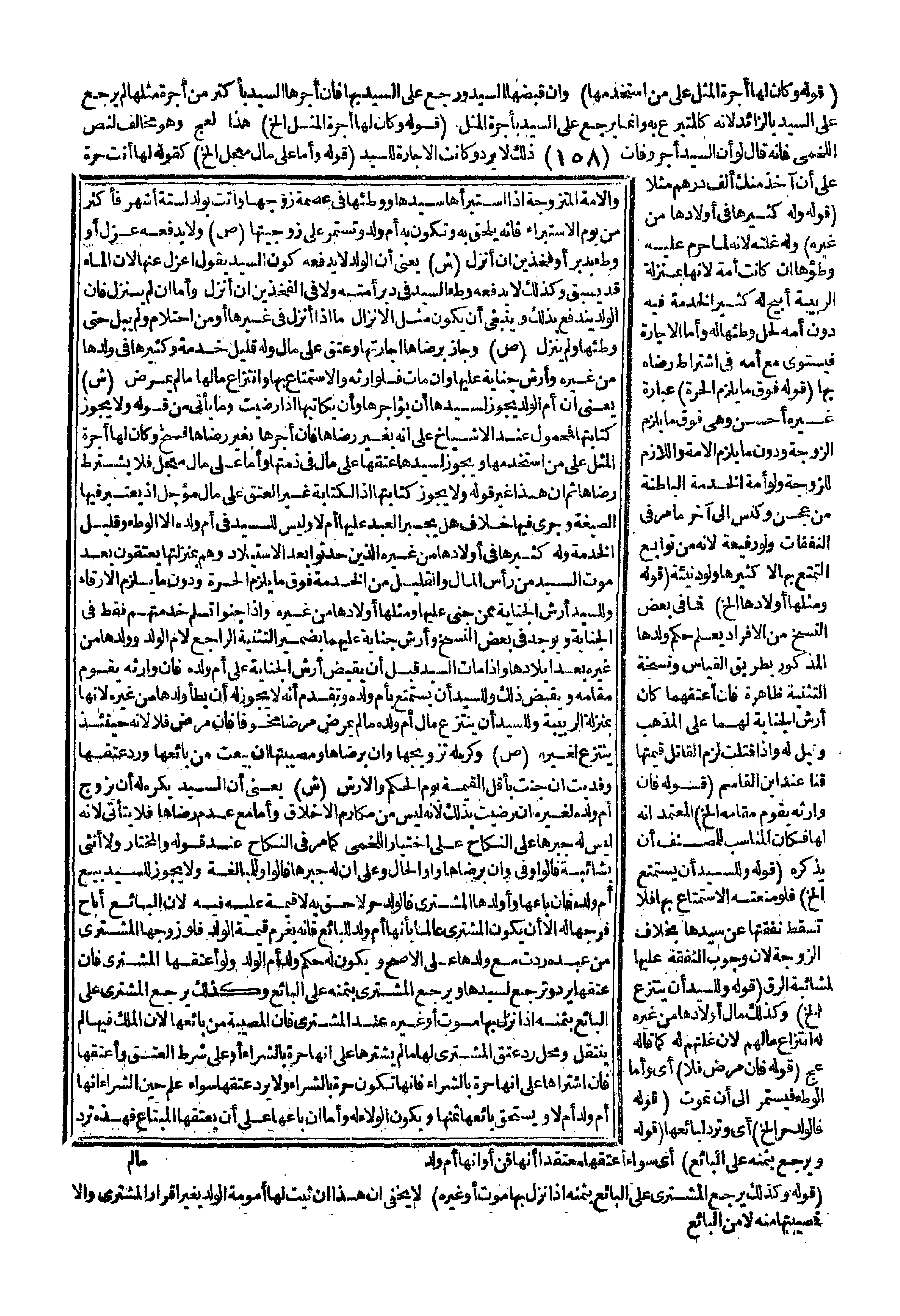 ـــــــــــــــــــــــــــــQ (قَوْلُهُ وَكَانَ لَهَا أُجْرَةُ الْمِثْلِ عَلَى مَنْ اسْتَخْدَمَهَا) وَإِنْ قَبَضَهَا السَّيِّدُ وَرَجَعَ عَلَى السَّيِّدِ بِهَا فَإِنْ أَجَّرَهَا السَّيِّدُ بِأَكْثَرَ مِنْ أُجْرَةِ مِثْلِهَا لَمْ يَرْجِعْ عَلَى السَّيِّدِ بِالزَّائِدِ لِأَنَّهُ كَالْمُتَبَرِّعِ بِهِ وَإِنَّمَا يَرْجِعُ عَلَى السَّيِّدِ بِأُجْرَةِ الْمِثْلِ (قَوْلُهُ وَكَانَ لَهَا أُجْرَةُ الْمِثْلِ إلَخْ) هَذَا لعج وَهُوَ مُخَالِفٌ لِنَصِّ اللَّخْمِيِّ فَإِنَّهُ قَالَ لَوْ أَنَّ السَّيِّدَ أَجَّرَ وَفَاتَ ذَلِكَ لَا يَرُدُّ وَكَانَتْ الْإِجَارَةُ لِلسَّيِّدِ (قَوْلُهُ وَأَمَّا عَلَى مَالٍ مُعَجَّلٍ إلَخْ) كَقَوْلِهِ لَهَا أَنْتِ حُرَّةٌ عَلَى أَنْ آخُذَ مِنْك أَلْفَ دِرْهَمٍ مَثَلًا (قَوْلُهُ وَلَهُ كَثِيرُهَا فِي أَوْلَادِهَا مِنْ غَيْرِهِ) وَلَهُ غَلَّتُهُ؛ لِأَنَّهُ؛ لَمَّا حُرِّمَ عَلَيْهِ وَطْؤُهَا إنْ كَانَتْ أَمَةً لِأَنَّهَا بِمَنْزِلَةِ الرَّبِيبَةِ أُبِيحَ لَهُ كَثِيرُ الْخِدْمَةِ فِيهِ دُونَ أُمِّهِ لِحِلِّ وَطْئِهَا لَهُ وَأَمَّا الْإِجَارَةُ فَيَسْتَوِي مَعَ أُمِّهِ فِي اشْتِرَاطِ رِضَاهُ بِهَا (قَوْلُهُ فَوْقَ مَا يَلْزَمُ الْحُرَّةَ) عِبَارَةُ غَيْرِهِ أَحْسَنُ وَهِيَ فَوْقَ مَا يَلْزَمُ الزَّوْجَةَ وَدُونَ مَا يَلْزَمُ الْأَمَةَ وَاللَّازِمُ لِلزَّوْجَةِ لَوْ أَمَةً الْخِدْمَةُ الْبَاطِنَةُ مِنْ عَجْنٍ وَكَنْسٍ إلَى آخِرِ مَا مَرَّ فِي النَّفَقَاتِ وَلَوْ رَفِيعَةً؛ لِأَنَّهُ؛ مِنْ تَوَابِعِ التَّمَتُّعِ بِهَا لَا كَثِيرُهَا وَلَوْ دَنِيئَةً (قَوْلُهُ وَمِثْلُهَا أَوْلَادُهَا إلَخْ) فَمَا فِي بَعْضِ النُّسَخِ مِنْ الْإِفْرَادِ يُعْلَمُ حُكْمُ وَلَدِهَا الْمَذْكُورِ بِطَرِيقِ الْقِيَاسِ وَنُسْخَةُ التَّثْنِيَةِ ظَاهِرَةٌ فَإِنْ أَعْتَقَهُمَا كَانَ أَرْشُ الْجِنَايَةِ لَهُمَا عَلَى الْمَذْهَبِ وَقِيلَ لَهُ وَإِذَا قَتَلَتْ لَزِمَ الْقَاتِلَ قِيمَتُهَا قِنًّا عِنْدَ ابْنِ الْقَاسِمِ (قَوْلُهُ فَإِنَّ وَارِثَهُ يَقُومُ مَقَامَهُ إلَخْ) الْمُعْتَمَدُ أَنَّهُ لَهَا فَكَانَ الْمُنَاسِبُ لِلْمُصَنِّفِ أَنْ يَذْكُرَهُ (قَوْلُهُ وَلِلسَّيِّدِ أَنْ يَسْتَمْتِعَ إلَخْ) فَلَوْ مَنَعَهُ الِاسْتِمْتَاعَ بِهَا فَلَا تَسْقُطُ نَفَقَتُهَا عَنْ سَيِّدِهَا بِخِلَافِ الزَّوْجَةِ؛ لِأَنَّ؛ وُجُودَ النَّفَقَةِ عَلَيْهَا لِشَائِبَةِ الرِّقِّ (قَوْلُهُ وَلِلسَّيِّدِ أَنْ يَنْتَزِعَ إلَخْ) وَكَذَلِكَ مَالُ أَوْلَادِهَا مِنْ غَيْرِهِ لَهُ انْتِزَاعُ مَالِهِمْ؛ لِأَنَّ؛ غَلَّتَهُمْ لَهُ كَمَا قَالَهُ عج (قَوْلُهُ فَإِنْ مَرِضَ فَلَا) أَيْ وَأَمَّا الْوَطْءُ فَيَسْتَمِرُّ إلَى أَنْ تَمُوتَ