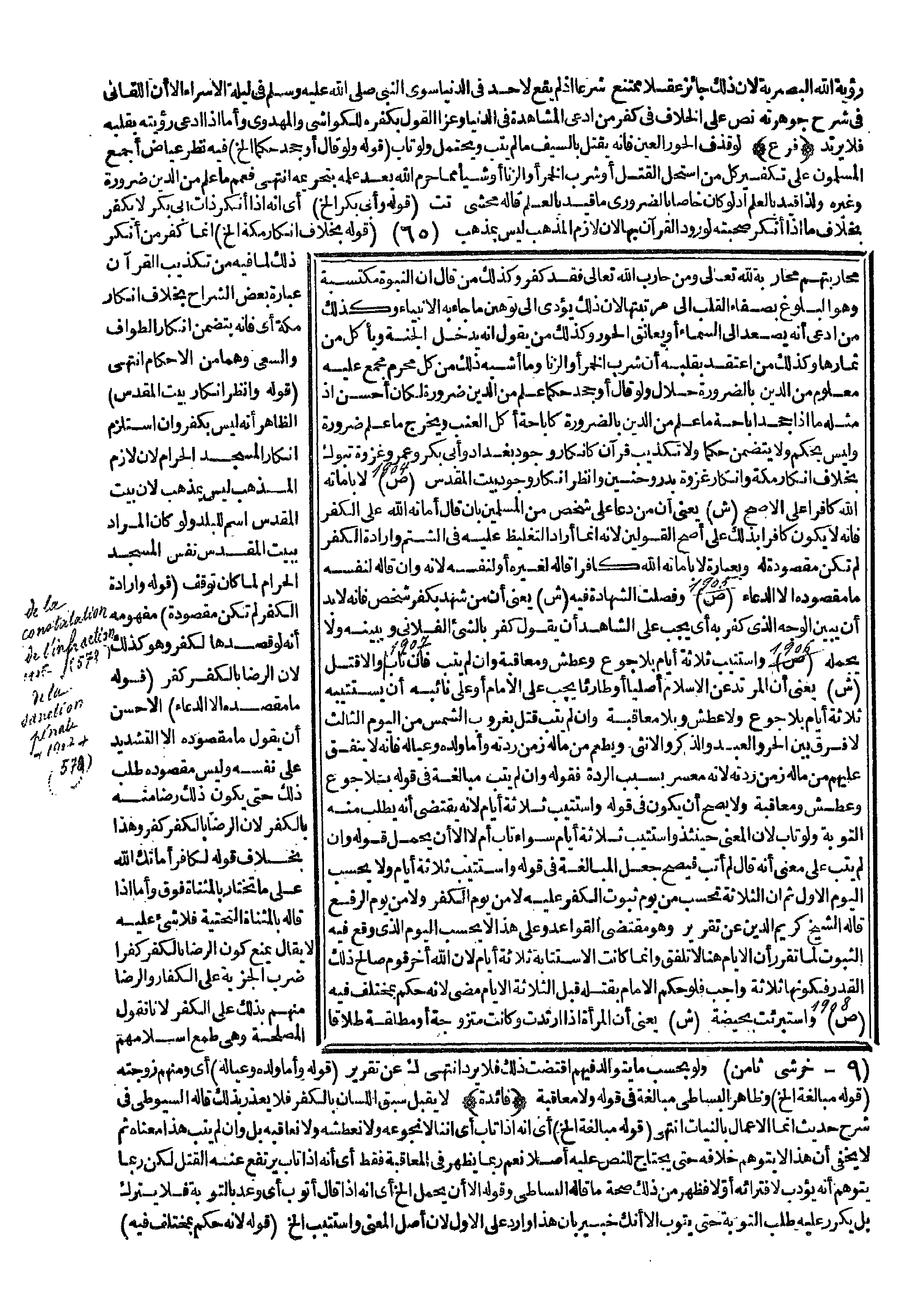 مُحَارَبَتَهُمْ مُحَارَبَةٌ لِلَّهِ تَعَالَى، وَمَنْ حَارَبَ اللَّهَ تَعَالَى فَقَدْ كَفَرَ، وَكَذَلِكَ مَنْ قَالَ: إنَّ النُّبُوَّةَ مُكْتَسَبَةٌ وَهُوَ الْبُلُوغُ بِصَفَاءِ الْقَلْبِ إلَى مَرْتَبَتِهَا؛ لِأَنَّ ذَلِكَ يُؤَدِّي إلَى تَوْهِينِ مَا جَاءَ بِهِ الْأَنْبِيَاءُ، وَكَذَلِكَ مَنْ ادَّعَى أَنَّهُ يَصْعَدُ إلَى السَّمَاءِ، أَوْ يُعَانِقُ الْحُورَ وَكَذَلِكَ مَنْ يَقُولُ: إنَّهُ يَدْخُلُ الْجَنَّةَ، وَيَأْكُلُ مِنْ ثِمَارِهَا، وَكَذَلِكَ مَنْ اعْتَقَدَ بِقَلْبِهِ أَنَّ شُرْبَ الْخَمْرِ، أَوْ الزِّنَا، وَمَا أَشْبَهَ ذَلِكَ مِنْ كُلِّ مُحَرَّمٍ مُجْمَعٍ عَلَيْهِ مَعْلُومٍ مِنْ الدِّينِ بِالضَّرُورَةِ حَلَالٌ، وَلَوْ قَالَ: أَوْ جَحَدَ حُكْمًا عُلِمَ مِنْ الدِّينِ ضَرُورَةً لَكَانَ أَحْسَنَ إذْ مِثْلُهُ مَا إذَا جَحَدَ إبَاحَةَ مَا عُلِمَ مِنْ الدِّينِ بِالضَّرُورَةِ كَإِبَاحَةِ أَكْلِ الْعِنَبِ، وَيَخْرُجُ مَا عُلِمَ ضَرُورَةً، وَلَيْسَ بِحُكْمٍ، وَلَا يَتَضَمَّنُ حُكْمًا، وَلَا تَكْذِيبَ قُرْآنٍ كَإِنْكَارِ وُجُودِ بَغْدَادَ وَأَبِي بَكْرٍ، وَعُمَرَ، وَغَزْوَةِ تَبُوكَ بِخِلَافِ إنْكَارِ مَكَّةَ وَإِنْكَارِ غَزْوَةِ بَدْرٍ وَحُنَيْنٍ، وَانْظُرْ إنْكَارَ وُجُودِ بَيْتِ الْمَقْدِسِ