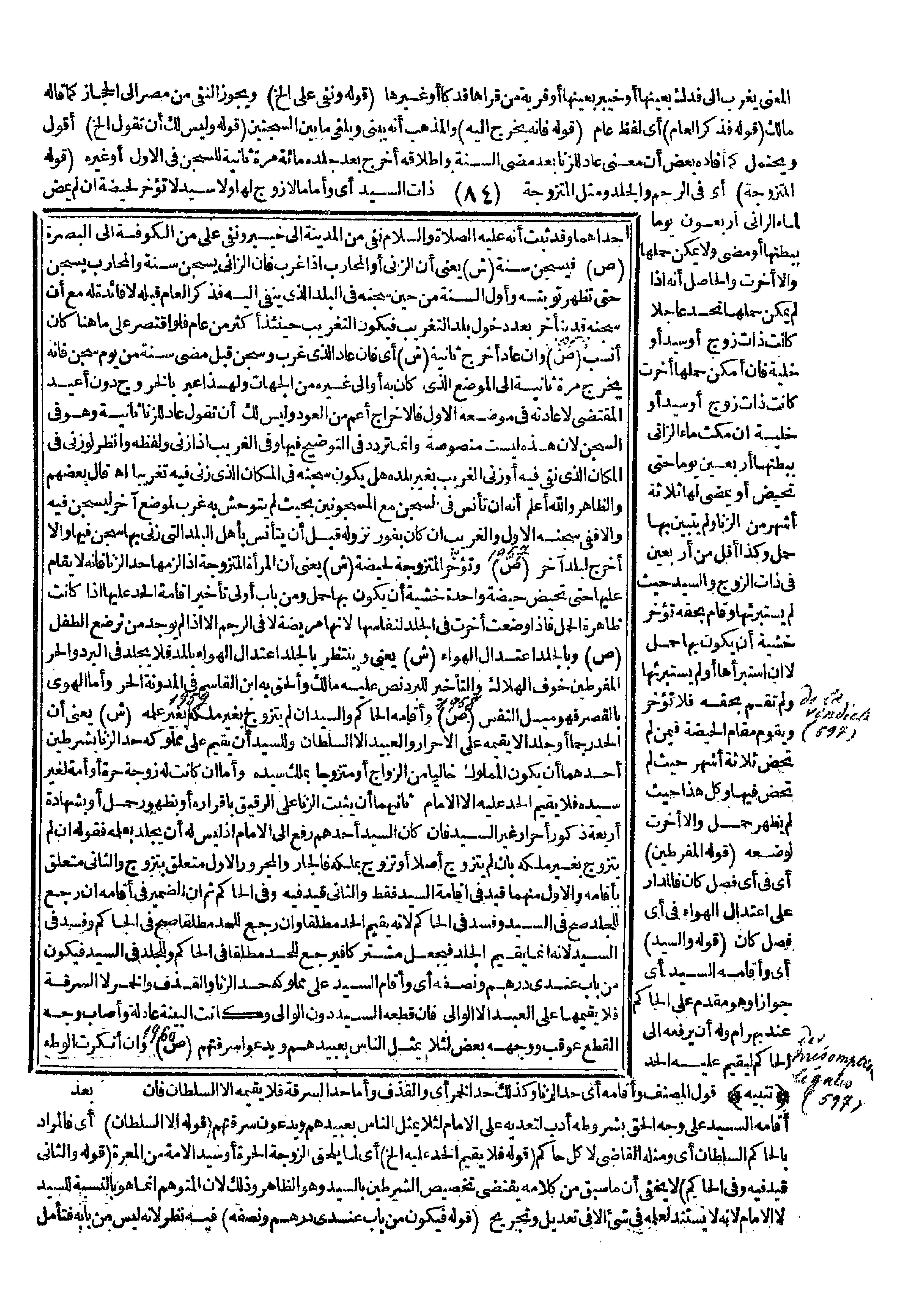 . (قَوْلُهُ: الْمُتَزَوِّجَةُ) أَيْ: فِي الرَّجْمِ وَالْجَلْدِ، وَمِثْلُ الْمُتَزَوِّجَةِ ذَاتُ السَّيِّدِ أَيْ: وَأَمَّا مَا لَا زَوْجَ لَهَا وَلَا سَيِّدَ لَا تُؤَخَّرُ لِحَيْضَةٍ إنْ لَمْ يَمْضِ لِمَاءِ الزَّانِي أَرْبَعُونَ يَوْمًا بِبَطْنِهَا، أَوْ مَضَى وَلَا يُمْكِنُ حَمْلُهَا وَإِلَّا أُخِّرَتْ، وَالْحَاصِلُ أَنَّهُ إذَا لَمْ يُمْكِنْ حَمْلُهَا تُحَدُّ عَاجِلًا كَانَتْ ذَاتَ زَوْجٍ أَوْ سَيِّدٍ، أَوْ خَلِيَّةً فَإِنْ أَمْكَنَ حَمْلُهَا أُخِّرَتْ كَانَتْ ذَاتَ زَوْجٍ، أَوْ سَيِّدٍ أَوْ خَلِيَّةً إنْ مَكَثَ مَاءُ الزَّانِي بِبَطْنِهَا أَرْبَعِينَ يَوْمًا حَتَّى تَحِيضَ، أَوْ يَمْضِيَ لَهَا ثَلَاثَةُ أَشْهُرٍ مِنْ الزِّنَا، وَلَمْ يَتَبَيَّنْ بِهَا حَمْلٌ، وَكَذَا أَقَلُّ مِنْ أَرْبَعِينَ فِي ذَاتِ الزَّوْجِ وَالسَّيِّدِ حَيْثُ لَمْ يَسْتَبْرِئْهَا وَقَامَ بِحَقِّهِ تُؤَخَّرُ خَشْيَةَ أَنْ يَكُونَ بِهَا حَمْلٌ لَا إنْ اسْتَبْرَأَهَا، أَوْ لَمْ يَسْتَبْرِئْهَا، وَلَمْ تَقُمْ بِحَقِّهِ فَلَا تُؤَخَّرُ وَيَقُومُ مَقَامَ الْحَيْضَةِ فِيمَنْ لَمْ تَحِضْ ثَلَاثَةَ أَشْهُرٍ حَيْثُ لَمْ تَحِضْ فِيهَا وَكُلُّ هَذَا حَيْثُ لَمْ يَظْهَرْ حَمْلٌ، وَإِلَّا أُخِّرَتْ لِوَضْعِهِ. (قَوْلُهُ: الْمُفْرِطَيْنِ) أَيْ: فِي أَيِّ فَصْلٍ كَانَ فَالْمَدَارُ عَلَى اعْتِدَالِ الْهَوَاءِ فِي أَيِّ فَصْلٍ كَانَ