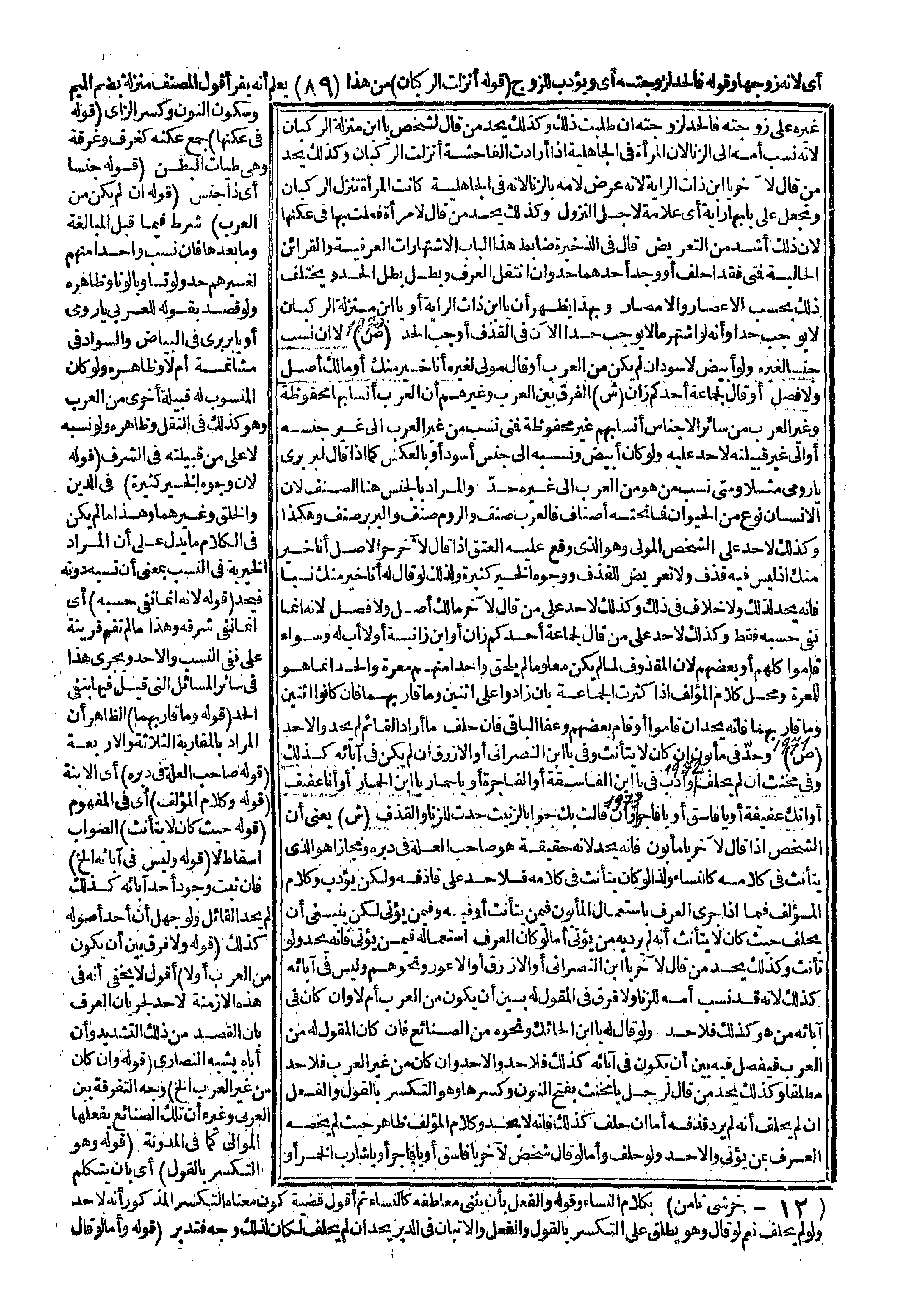 غَيْرِهِ عَلَى زَوْجَتِهِ، فَالْحَدُّ لِزَوْجَتِهِ إنْ طَلَبَتْ ذَلِكَ، وَكَذَلِكَ يُحَدُّ مَنْ قَالَ لِشَخْصٍ: يَا ابْنَ مُنْزِلَةِ الرُّكْبَانِ؛ لِأَنَّهُ نَسَبَ أُمَّهُ إلَى الزِّنَا؛ لِأَنَّ الْمَرْأَةَ فِي الْجَاهِلِيَّةِ إذَا أَرَادَتْ الْفَاحِشَةَ أَنْزَلَتْ الرُّكْبَانَ، وَكَذَلِكَ يُحَدُّ مَنْ قَالَ لِآخَرَ: يَا ابْنَ ذَاتِ الرَّايَةِ؛ لِأَنَّهُ عَرَّضَ لِأُمِّهِ بِالزِّنَا؛ لِأَنَّهُ فِي الْجَاهِلِيَّةِ كَانَتْ الْمَرْأَةُ تُنْزِلُ الرُّكْبَانَ، وَتَجْعَلُ عَلَى بَابِهَا رَايَةً أَيْ: عَلَامَةً لِأَجْلِ النُّزُولِ، وَكَذَلِكَ يُحَدُّ مَنْ قَالَ لِامْرَأَةٍ: فَعَلَتْ بِهَا فِي عُكَنِهَا لِأَنَّ ذَلِكَ أَشَدُّ مِنْ التَّعْرِيضِ قَالَ فِي الذَّخِيرَةِ ضَابِطُ هَذَا الْبَابِ الِاشْتِهَارَاتُ الْعُرْفِيَّةُ، وَالْقَرَائِنُ الْحَالِيَّةُ فَمَتَى فُقِدَا حُلِّفَ، أَوْ وُجِدَ أَحَدُهُمَا حُدَّ، وَإِنْ انْتَقَلَ الْعُرْفُ وَبَطَلَ بَطَلَ الْحَدُّ، وَيَخْتَلِفُ ذَلِكَ بِحَسَبِ الْأَعْصَارِ وَالْأَمْصَارِ، وَبِهَذَا يَظْهَرُ أَنَّ يَا ابْنَ ذَاتِ الرَّايَةِ، أَوْ يَا ابْنَ مُنْزِلَةِ الرُّكْبَانِ لَا يُوجِبُ حَدًّا وَأَنَّهُ لَوْ اُشْتُهِرَ مَا لَا يُوجِبُ حَدًّا الْآنَ فِي الْقَذْفِ أَوْجَبَ الْحَدَّ