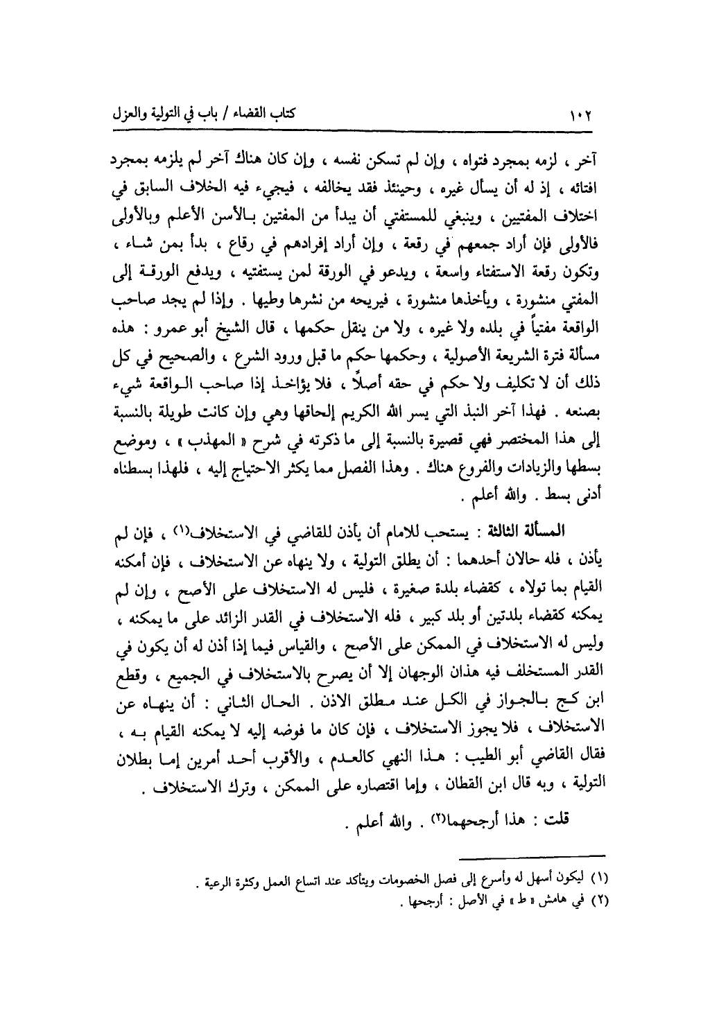آخر، لزمه بمجرد فتواه، وإن لم تسكن نفسه، وإن كان هناك آخر لم يلزمه بمجرد إفتائه، إذ له أن يسأل غيره، وحينئذ فقد يخالفه، فيجئ فيه الخلاف السابق في اختلاف المفتيين، وينبغي للمستفتي أن يبدأ من المفتين بالاسن الاعلم وبالاولى فالاولى فإن أراد جمعهم في رقعة، وإن أراد إفرادهم في رقاع، بدأ بمن شاء، وتكون رقعة الاستفتاء واسعة، ويدعو في الورقة لمن يستفتيه، ويدفع الورقة إلى المفتي منشورة، ويأخذها منشورة، فيريحه من نشرها وطيها. وإذا لم يجد صاحب الواقعة مفتيا في بلده ولا غيره، ولا من ينقل حكمها، قال الشيخ أبو عمرو: هذه مسألة فترة الشريعة الاصولية وحكمها حكم ما قبل ورود الشرع، والصحيح في كل ذلك أن لا تكليف ولا حكم في حقه أصلا، فلا يؤاخذ إذا صاحب الواقعة شئ بصنعه. فهذا آخر النبذ التي يسر الله الكريم إلحاقها وهي وإن كانت طويلة بالنسبة إلى هذا المختصر فهي قصيرة بالنسبة إلى ما ذكرته في شرح المهذب، وموضع بسطها والزيادات والفروع هناك. وهذا الفصل مما يكثر الاحتياج إليه، فلهذا بسطناه أدنى بسط. والله أعلم. المسألة الثالثة: يستحب للامام أن يأذن للقاضي في الاستخلاف، فإن لم يأذن، فله حالان أحدهما: أن يطلق التولية، ولا ينهاه عن الاستخلاف، فإن أمكنه القيام بما تولاه، كقضاء بلدة صغيرة، فليس له الاستخلاف على الاصح، وإن لم يمكنه كقضاء بلدتين أو بلد كبير، فله الاستخلاف في القدر الزائد على ما يمكنه، وليس له الاستخلاف في الممكن على الاصح، والقياس فيما إذا أذن له أن يكون في القدر المستخلف فيه هذان الوجهان إلا أن يصرح بالاستخلاف في الجميع، وقطع ابن كج بالجواز في الكل عند مطلق الاذن. الحال الثاني: أن ينهاه عن الاستخلاف، فلا يجوز الاستخلاف، فإن كان ما فوضه إليه لا يمكنه القيام به، فقال القاضي أبو الطيب: هذا النهي كالعدم، والاقرب أحد أمرين إما بطلان التولية، وبه قال ابن القطان، وإما اقتصاره على الممكن، وترك الاستخلاف. قلت: هذا أرجحهما. والله أعلم.