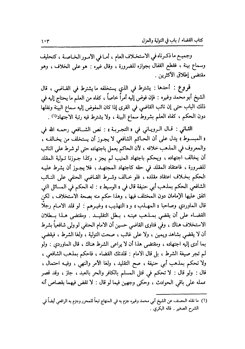 وجميع ما ذكرناه في الاستخلاف العام، أما في الامور الخاصة، كتحليف وسماع بينة، فقطع القفال بجوازه للضرورة، وقال غيره: هو على الخلاف، وهو مقتضى إطلاق الاكثرين. فروع أحدها: يشترط في الذي يستخلفه ما يشترط في القاضي، قال الشيخ أبو محمد وغيره: فإن فوض إليه أمرا خاصا، كفاه من العلم ما يحتاج إليه في ذلك الباب حتى إن نائب القاضي في القرى إذا كان المفوض إليه سماع البينة ونقلها دون الحكم، كفاه العلم بشروط سماع البينة ولا يشترط فيه رتبة الاجتهاد. الثاني: قال الروياني في التجربة: نص الشافعي رحمه الله في المبسوط يدل على أن الحاكم الشافعي لا يجوز أن يستخلف من يخالفه، والمعروف في المذهب خلافه، لان الحاكم يعمل باجتهاده حتى لو شرط على النائب أن يخالف اجتهاده، ويحكم باجتهاد المنيب لم يجز، وكذا إذا جوزنا تولية المقلد للضرورة، فاعتقاد المقلد في حقه كاجتهاد المجتهد، فلا يجوز أن يشرط عليه الحكم بخلاف اعتقاد مقلده، فلو خالف وشرط القاضي الحنفي على النائب الشافعي الحكم بمذهب أبي حنيفة قال في الوسيط: له الحكم في المسائل التي اتفق عليها الامامان دون المختلف فيها، وهذا حكم منه بصحة الاستخلاف، لكن قال الماوردي وصاحبا المهذب والتهذيب وغيرهم: لو قلد الامام رجلا القضاء على أن يقضي بمذهب عينه، بطل التقليد. ومقتضى هذا بطلان الاستخلاف هناك، وفي فتاوى القاضي حسين أن الامام الحنفي لو ولى شافعيا بشرط أن لا يقضي بشاهد ويمين، ولا على غائب، صحت التولية، ولغا الشرط، فيقضي بما أدى إليه اجتهاده، ومقتضى هذا أن لا يراعى الشرط هناك، قال الماوردي: ولو لم تجر صيغة الشرط، بل قال الامام: قلدتك القضاء، فاحكم بمذهب الشافعي، ولا تحكم بمذهب أبي حنيفة، صح التقليد، ولغا الامر والنهي، وفيه احتمال، قال: ولو قال: لا تحكم في قتل المسلم بالكافر والحر بالعبد، جاز، وقد قصر عمله على باقي الحوادث، وحكى وجهين فيما لو قال: لا تقض فيهما بقصاص أنه