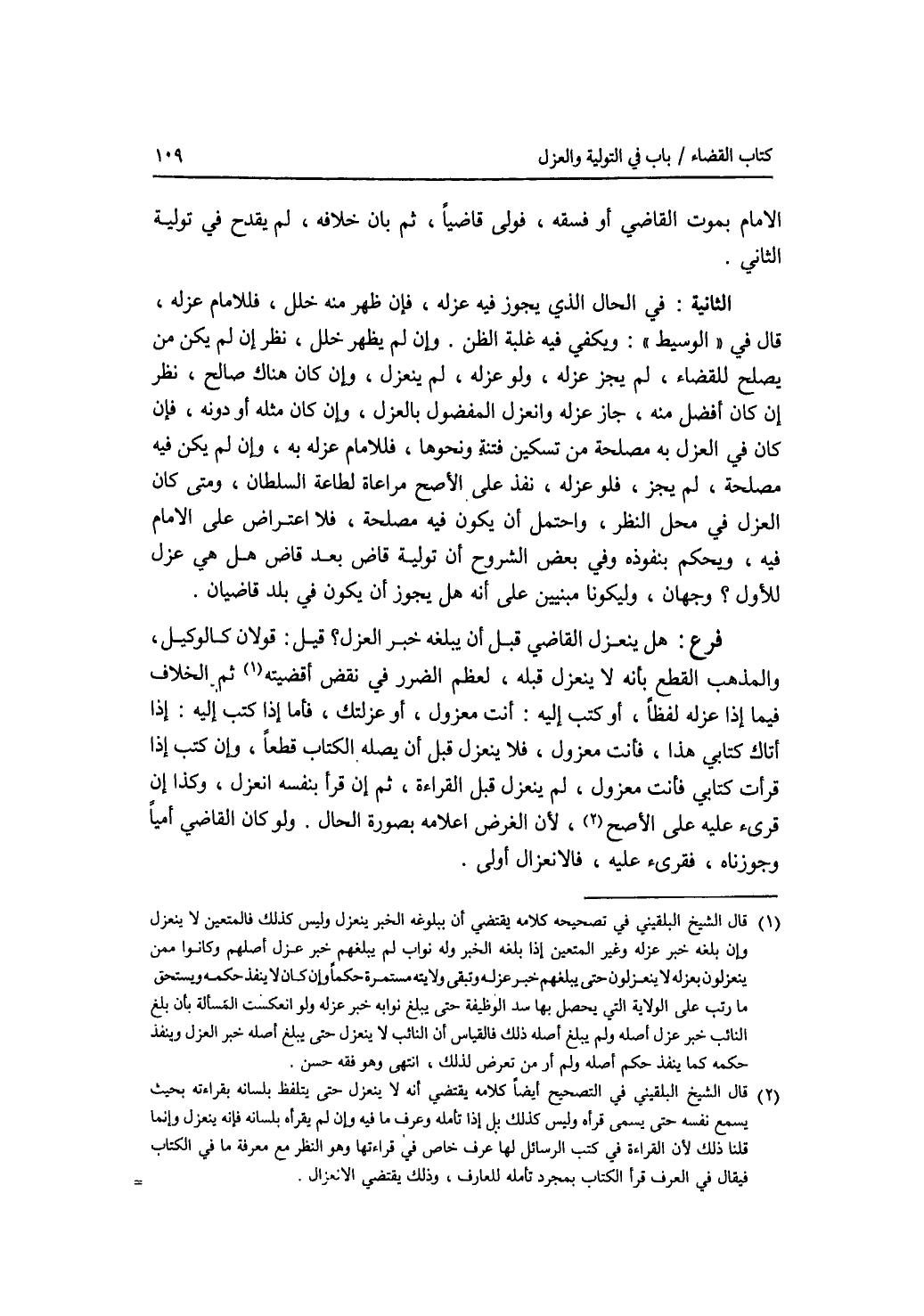 الامام بموت القاضي أو فسقه، فولى قاضيا، ثم بان خلافه، لم يقدح في تولية الثاني. الثانية: في الحال الذي يجوز فيه عزله، فإن ظهر منه خلل، فللامام عزله، قال في الوسيط: ويكفي فيه غلبة الظن. وإن لم يظهر خلل، نظر إن لم يكن من يصلح للقضاء، لم يجز عزله، ولو عزله، لم ينعزل، وإن كان هناك صالح، نظر إن كان أفضل منه، جاز عزله وانعزل المفضول بالعزل، وإن كان مثله أو دونه، فإن كان في العزل به مصلحة من تسكين فتنة ونحوها، فللامام عزله به، وإن لم يكن فيه مصلحة، لم يجز، فلو عزله، نفذ على الاصح مراعاة لطاعة السلطان، ومتى كان العزل في محل النظر، واحتمل أن يكون فيه مصلحة، فلا اعتراض على الامام فيه، ويحكم بنفوذه وفي بعض الشروح أن تولية قاض بعد قاض هل هي عزل للاول ؟ وجهان، وليكونا مبنيين على أنه هل يجوز أن يكون في بلد قاضيان. فرع هل ينعزل القاضي قبل أن يبلغه خبر العزل ؟ قيل: قولان كالوكيل، والمذهب القطع بأنه لا ينعزل قبله، لعظم الضرر في نقض أقضيته، ثم الخلاف فيما إذا عزله لفظا، أو كتب إليه: أنت معزول، أو عزلتك، فأما إذا كتب إليه: إذا أتاك كتابي هذا، فأنت معزول، فلا ينعزل قبل أن يصله الكتاب قطعا، وإن كتب إذا قرأت كتابي فأنت معزول، لم ينعزل قبل القراءة، ثم إن قرأ بنفسه انعزل، وكذا إن قرئ عليه على الاصح، لان الغرض إعلامه بصورة الحال. ولو كان القاضي أميا وجوزناه، فقرئ عليه، فالانعزال أولى.