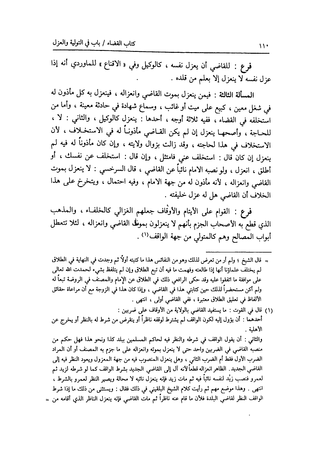 فرع للقاضي أن يعزل نفسه، كالوكيل وفي الاقناع للماوردي أنه إذا عزل نفسه لا ينعزل إلا بعلم من قلده. المسألة الثالثة: فيمن ينعزل بموت القاضي وانعزاله، فينعزل به كل مأذون له في شغل معين، كبيع على ميت أو غائب، وسماع شهادة في حادثة معينة، وأما من استخلفه في القضاء، ففيه ثلاثة أوجه، أحدها: ينعزل كالوكيل، والثاني: لا، للحاجة، وأصحها ينعزل إن لم يكن القاضي مأذونا له في الاستخلاف، لان الاستخلاف في هذا لحاجته، وقد زالت بزوال ولايته، وإن كان مأذونا له فيه لم ينعزل إن كان قال: استخلف عني فامتثل، وإن قال: استخلف عن نفسك، أو أطلق، انعزل، ولو نصبه الامام نائبا عن القاضي، قال السرخسي: لا ينعزل بموت القاضي وانعزاله، لانه مأذون له من جهة الامام، وفيه احتمال، ويتخرج على هذا الخلاف أن القاضي هل له عزل خليفته. فرع القوام على الايتام والاوقاف جعلهم الغزالي كالخلفاء، والمذهب الذي قطع به الاصحاب الجزم بأنهم لا ينعزلون بموت القاضي وانعزاله، لئلا تتعطل أبواب المصالح وهم كالمتولي من جهة الواقف.