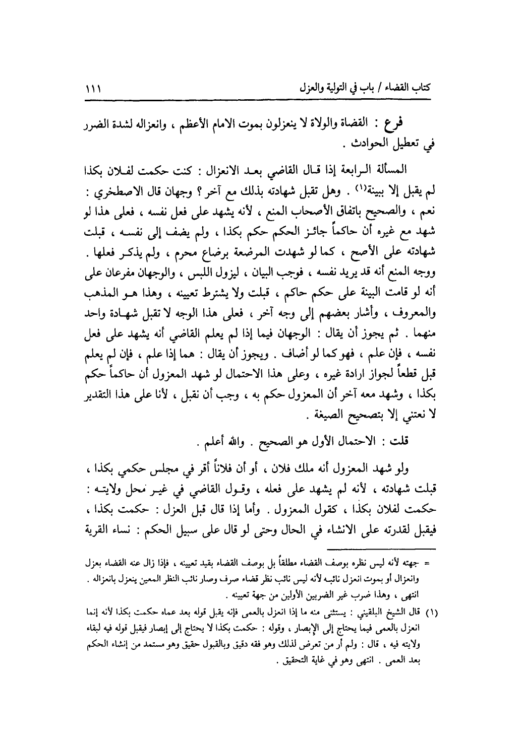 فرع القضاة والولاة لا ينعزلون بموت الامام الاعظم، وانعزاله لشدة الضرر في تعطيل الحوادث. المسألة الرابعة إذا قال القاضي بعد الانعزال: كنت حكمت لفلان بكذا لم يقبل إلا ببينة، وهل تقبل شهادته بذلك مع آخر ؟ وجهان قال الاصطخري: نعم، والصحيح باتفاق الاصحاب المنع، لانه يشهد على فعل نفسه، فعلى هذا لو شهد مع غيره أن حاكما جائز الحكم حكم بكذا، ولم يضف إلى نفسه، قبلت شهادته على الاصح، كما لو شهدت المرضعة برضاع محرم، ولم يذكر فعلها. ووجه المنع أنه قد يريد نفسه، فوجب البيان، ليزول اللبس، والوجهان مفرعان على أنه لو قامت البينة على حكم حاكم، قبلت ولا يشترط تعيينه، وهذا هو المذهب والمعروف، وأشار بعضهم إلى وجه آخر، فعلى هذا الوجه لا تقبل شهادة واحد منهما. ثم يجوز أن يقال: الوجهان فيما إذا لم يعلم القاضي أنه يشهد على فعل نفسه، فإن علم، فهو كما لو أضاف. ويجوز أن يقال: هما إذا علم، فإن لم يعلم قبل قطعا لجواز إرادة غيره. وعلى هذا الاحتمال لو شهد العزول أن حاكما حكم بكذا، وشهد معه آخر أن المعزول حكم به، وجب أن نقبل، لانا على هذا التقدير لا نعتني إلا بتصحيح الصيغة. قلت: الاحتمال الاول هو الصحيح. والله أعلم. ولو شهد المعزول أنه ملك فلان، أو أن فلانا أقر في مجلس حكمي بكذا، قبلت شهادته، لانه لم يشهد على فعله، وقول القاضي في غير محل ولايته: حكمت لفلان بكذا، كقول المعزول. وأما إذا قال قبل العزل: حكمت بكذا، فيقبل لقدرته على الانشاء في الحال وحتى لو قال على سبيل الحكم: نساء القرية