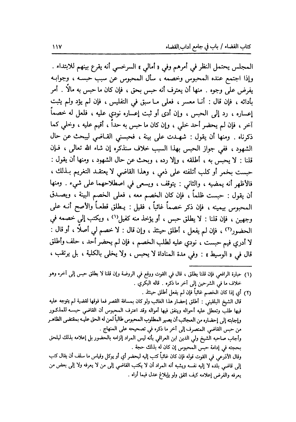 المجلس يحتمل النظر في أمرهم وفي أمالي السرخسي أنه يقرع بينهم للابتداء. وإذا اجتمع عنده المحبوس وخصمه، سأل المحبوس عن سبب حبسه، وجوابه يفرض على وجوه، منها أن يعترف أنه حبس بحق، فإن كان ما حبس به مالا، أمر بأدائه، فإن قال: أنا معسر، فعلى ما سبق في التفليس، فإن لم يؤد ولم يثبت إعساره، رد إلى الحبس، وإن أدى أو ثبت إعساره نودي عليه، فلعل له خصما آخر، فإن لم يحضر أحد خلي، وإن كان ما حبس به حدا، أقيم عليه، وخلي كما ذكرناه. ومنها أن يقول: شهدت على بينة، فحبسني القاضي ليبحث عن حال الشهود، ففي جواز الحبس بهذا السبب خلاف سنذكره إن شاء الله تعالى، فإن قلنا: لا يحبس به، أطلقه، وإلا رده، وبحث عن حال الشهود، ومنها أن يقول: حبست بخمر أو كلب أتلفته على ذمي، وهذا القاضي لا يعتقد التغريم بذلك، فالاظهر أنه يمضيه، والثاني: يتوقف، ويسعى في اصطلاحهما على شئ. ومنها أن يقول: حبست ظلما، فإن كان الخصم معه، فعلى الخصم البينة، ويصدق المحبوس بيمينه، فإن ذكر خصما غائبا، فقيل: يطلق قطعا، والاصح أنه على وجهين، فإن قلنا: لا يطلق حبس، أو يؤخذ منه كفيل، ويكتب إلى خصمه في الحضور، فإن لم يفعل، أطلق حينئذ، وإن قال: لا خصم لي أصلا، أو قال: لا أدري فيم حبست، نودي عليه لطلب الخصم، فإن لم يحضر أحد، حلف وأطلق قال في الوسيط: وفي مدة المناداة لا يحبس، ولا يخلى بالكلية، بل يرتقب،