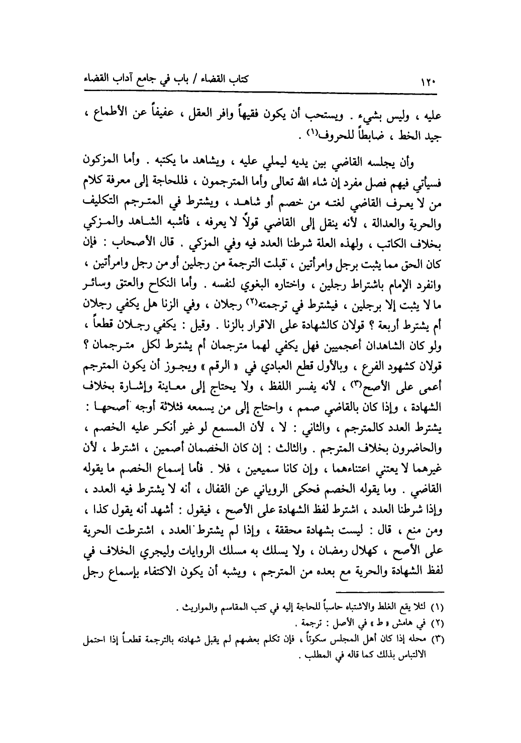 عليه، وليس بشئ. ويستحب أن يكون فقيها وافر العقل، عفيفا عن الاطماع، جيد الخط، ضابطا للحروف، وأن يجلسه القاضي بين يديه ليملي عليه، ويشاهد ما يكتبه. وأما المزكون فسيأتي فيهم فصل مفرد إن شاء الله تعالى. وأما المترجمون، فللحاجة إلى معرفة كلام من لا يعرف القاضي لغته من خصم أو شاهد، ويشترط في المترجم التكليف والحرية والعدالة، لانه ينقل إلى القاضي قولا لا يعرفه، فأشبه الشاهد والمزكي بخلاف الكاتب، ولهذه العلة شرطنا العدد فيه وفي المزكي. قال الاصحاب: فإن كان الحق مما يثبت برجل وامرأتين، قبلت الترجمة من رجلين أو من رجل وامرأتين، وانفرد الامام باشتراط رجلين، واختاره البغوي لنفسه. وأما النكاح والعتق وسائر ما لا يثبت إلا برجلين، فيشترط في ترجمته رجلان، وفي الزنا هل يكفي رجلان أم يشترط أربعة ؟ قولان كالشهادة على الاقرار بالزنا، وقيل: يكفي رجلان قطعا، ولو كان الشاهدان أعجميين فهل يكفي لهما مترجمان أم يشترط لكل مترجمان ؟ قولان كشهود الفرع، وبالاول قطع العبادي في الرقم، ويجوز أن يكون المترجم أعمى على الاصح، لانه يفسر اللفظ، ولا يحتاج إلى معاينة وإشارة بخلاف الشهادة، وإذا كان بالقاضي صمم، واحتاج إلى من يسمعه فثلاثة أوجه أصحها: يشترط العدد كالمترجم، والثاني: لا، لان المسمع لو غير أنكر عليه الخصم، والحاضرون بخلاف المترجم. والثالث: إن كان الخصمان أصمين، اشترط، لان غيرهما لا يعتني اعتناءهما، وإن كانا سميعين، فلا. فأما إسماع الخصم ما يقوله القاضي، وما يقوله الخصم، فحكى الروياني عن القفال، أنه لا يشترط فيه العدد، وإذا شرطنا العدد. اشترط لفظ الشهادة على الاصح، فيقول: أشهد أنه يقول كذا، ومن منع، قال: ليست بشهادة محققة، وإذا لم يشترط العدد، اشترطت الحرية على الاصح، كهلال رمضان، ولا يسلك به مسلك الروايات وليجري الخلاف في لفظ الشهادة والحرية مع بعده من المترجم، ويشبه أن يكون الاكتفاء بإسماع رجل