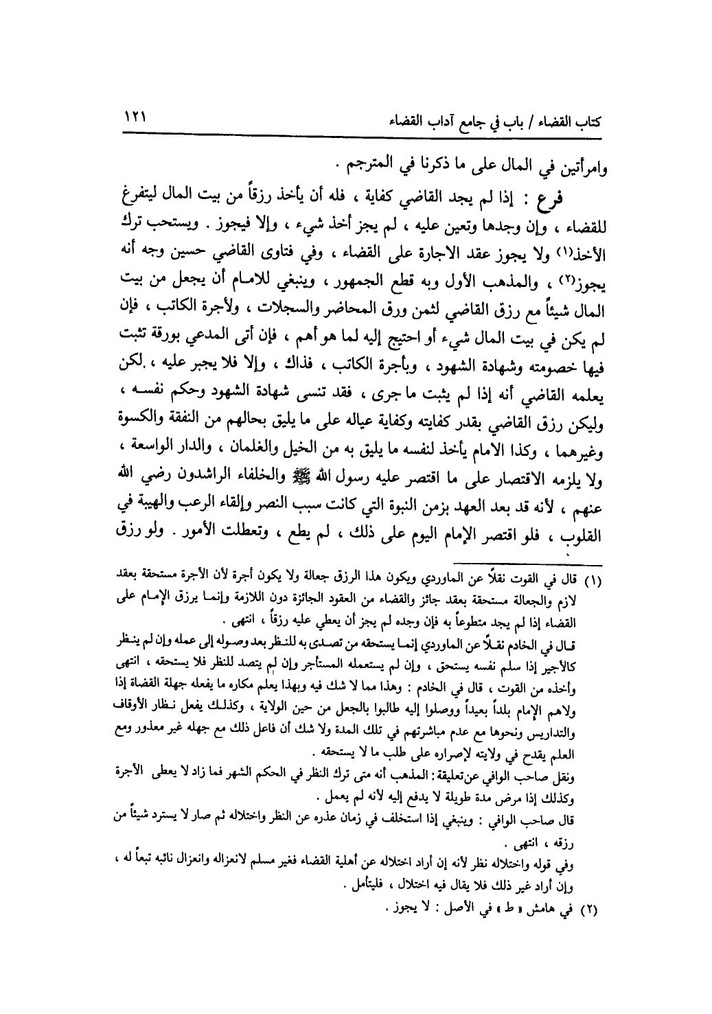 وامرأتين في المال على ما ذكرنا في المترجم. فرع إذا لم يجد القاضي كفاية، فله أن يأخذ رزقا من بيت المال ليتفرغ للقضاء، وإن وجدها وتعين عليه، لم يجز أخذ شئ، وإلا فيجوز. ويستحب ترك الاخذ، ولا يجوز عقد الاجارة على القضاء، وفي فتاوي القاضي حسين وجه أنه يجوز، والمذهب الاول وبه قطع الجمهور، وينبغي للامام أن يجعل من بيت المال شيئا مع رزق القاضي لثمن ورق المحاضر والسجلات، ولاجرة الكاتب، فإن لم يكن في بيت المال شئ أو احتيج إليه لما هو أهم، فإن أتى المدعي بورقة تثبت فيها خصومته وشهادة الشهود، وبأجرة الكاتب، فذاك، وإلا فلا يجبر عليه، لكن يعلمه القاضي أنه إذا لم يثبت ما جرى، فقد تنسى شهادة الشهود وحكم نفسه، وليكن رزق القاضي بقدر كفايته وكفاية عياله على ما يليق بحالهم من النفقة والكسوة وغيرهما، وكذا الامام يأخذ لنفسه ما يليق به من الخيل والغلمان، الدار الواسعة، ولا يلزمه الاقتصار على ما اقتصر عليه رسول الله - صلى الله عليه وسلم - والخلفاء الراشدون رضي الله عنهم، لانه قد بعد العهد بزمن النبوة التي كانت سبب النصر وإلقاء الرعب والهيبة في القلوب، فلو اقتصر الامام اليوم على ذلك، لم يطع، وتعطلت الامور. ولو رزق