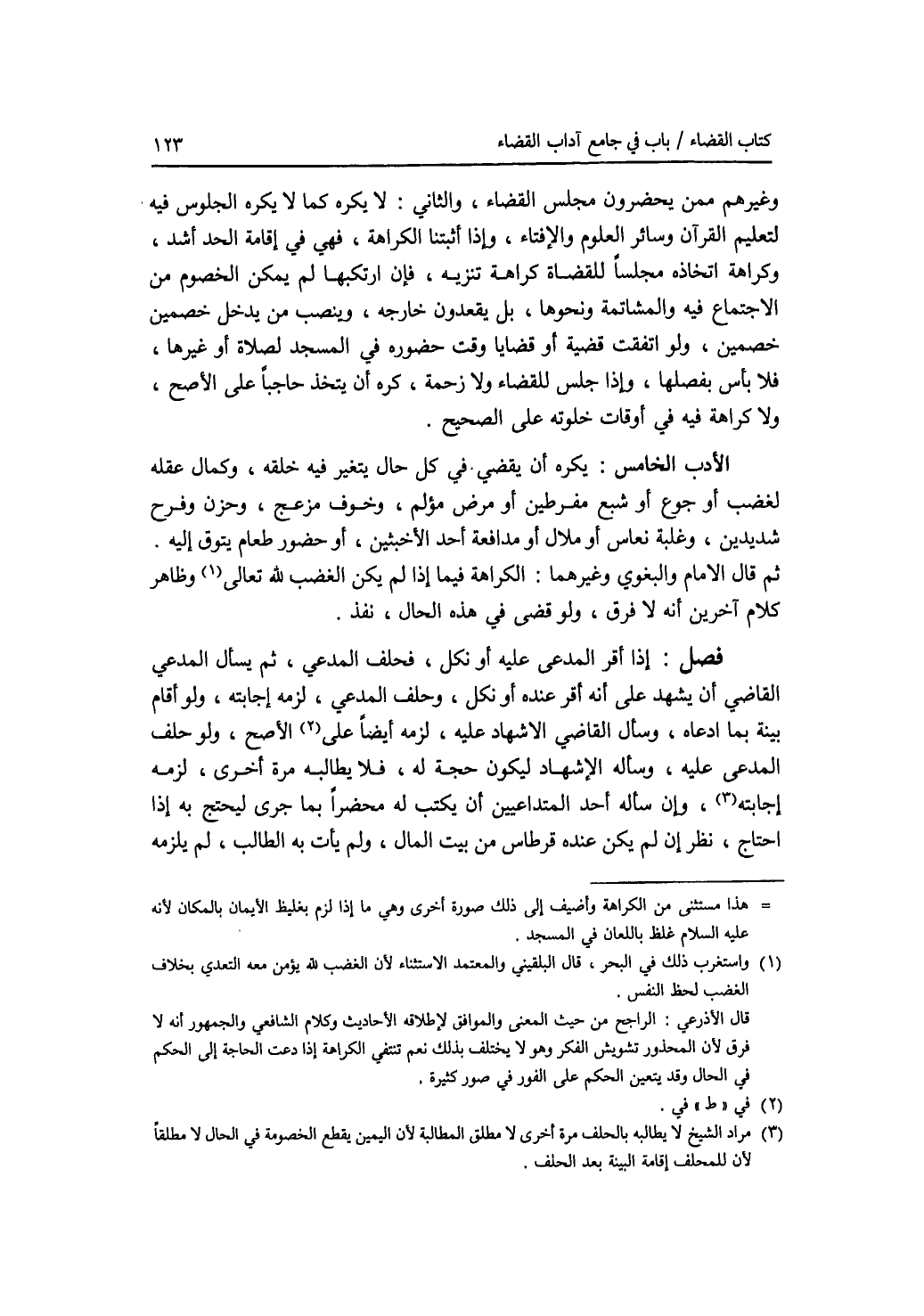 وغيرهم ممن يحضرون مجلس القضاء، والثاني: لا يكره كما لا يكره الجلوس فيه لتعليم القرآن وسائر العلوم والافتاء، وإذا أثبتنا الكراهة، فهي في إقامة الحد أشد، وكراهة اتخاذه مجلسا للقضاة كراهة تنزيه، فإن ارتكبها لم يمكن الخصوم من الاجتماع فيه والمشاتمة ونحوها، بل يقعدون خارجه، وينصب من يدخل خصمين خصمين، ولو اتفقت قضية أو قضايا وقت حضوره في المسجد لصلاة أو غيرها، فلا بأس بفصلها، وإذا جلس للقضاء ولا زحمة، كره أن يتخذ حاجبا على الاصح، ولا كراهة فيه في أوقات حلوته على الصحيح. الادب الخامس: يكره أن يقضي في كل حال يتغير فيه خلقه، وكمال عقله لغضب أو جوع أو شبع مفرطين أو مرض مؤلم، وخوف مزعج، وحزن وفرح شديدين، وغلبة نعاس أو ملال أو مدافعة أحد الاخبثين، أو حضور طعام يتوق إليه، ثم قال الامام والبغوي وغيرهما: الكراهة فيما إذا لم يكن الغضب لله تعالى، وظاهر كلام آخرين أنه لا فرق، ولو قضى في هذه الحال، نفذ. فصل إذا أقر المدعى عليه أو نكل، فحلف المدعي، ثم يسأل المدعي القاضي أن يشهد على أنه أقر عنده أو نكل، وحلف المدعي، لزمه إجابته. ولو أقام بينة بما ادعاه، وسأل القاضي الاشهاد عليه، لزمه أيضا في الاصح، ولو حلف المدعى عليه، وإن سأله الاشهاد ليكون حجة له، فلا يطالبه مرة أخرى، لزمه إجابته، وسأله أحد المتداعيين أن يكتب له محضرا بما جرى ليحتج به إذا احتاج، نظر إن لم يكن عنده قرطاس من بيت المال، ولم يأت به الطالب، لم يلزمه