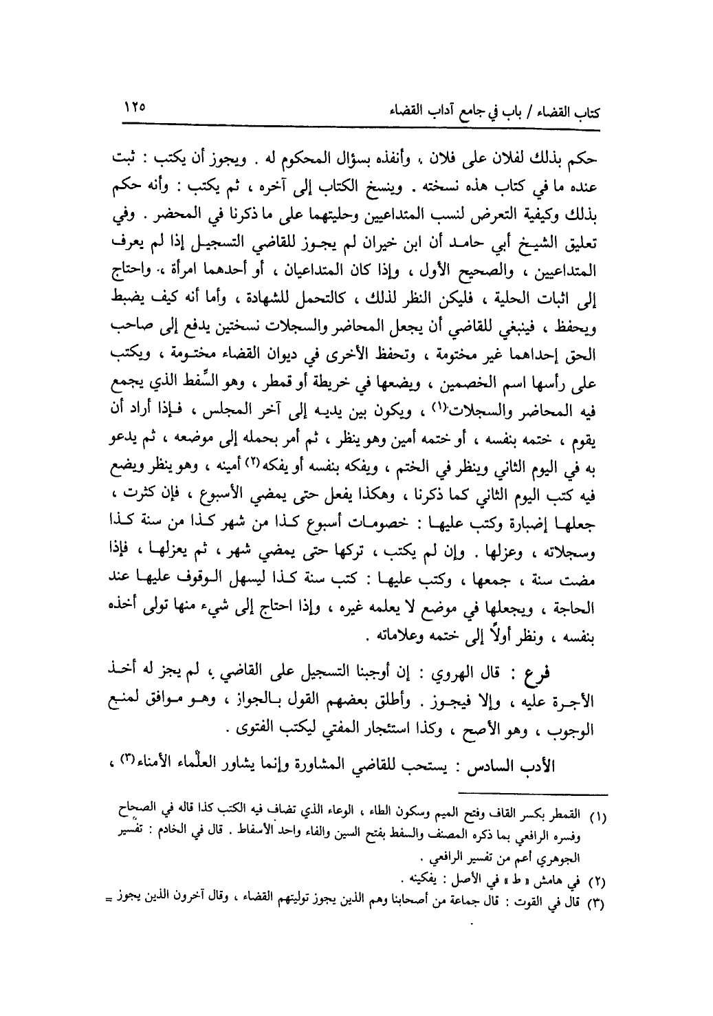 حكم بذلك لفلان على فلان، وأنفذه بسؤال المحكوم له. ويجوز أن يكتب: ثبت عنده ما في كتاب هذه نسخته، وينسخ الكتاب إلى آخره، ثم يكتب: وإنه حكم بذلك وكيفية التعرض لنسب المتداعيين وحليتهما على ما ذكرنا في المحضر. وفي تعليق الشيخ أبي حامد أن ابن خيران لم يجوز للقاضي التسجيل إذا لم يعرف المتداعيين، والصحيح الاول، وإذا كان المتداعيان، أو أحدهما امرأة، واحتاج إلى إثبات الحلية، فليكن النظر لذلك، كالتحمل للشهادة، وأما أنه كيف يضبط ويحفظ، فينبغي للقاضي أن يجعل المحاضر والسجلات نسختين يدفع إلى صاحب الحق إحداهما غير مختومة، وتحفظ الاخرى في ديوان القضاء مختومة، ويكتب على رأسها اسم الخصمين، ويضعها في خريطة أو قمطر، وهو السفط الذي يجمع فيه المحاضر والسجلات، ويكون بين يديه إلى آخر المجلس، فإذا أراد أن يقوم، ختمه بنفسه، أو ختمه أمين وهو ينظر، ثم أمر بحمله إلى موضعه، ثم يدعو به في اليوم الثاني وينظر في الختم، ويفكه بنفسه أو يفكه أمينه وهو ينظر ويضع فيه كتب اليوم الثاني كما ذكرنا، وهكذا يفعل حتى يمضي الاسبوع، فإن كثرت، جعلها إضبارة وكتب عليها: خصومات أسبوع كذا من شهر كذا من سنة كذا وسجلاته، ويعزلها. وإن لم يكتب، تركها حتى يمضي شهر، ثم بعزلها، فإذا مضت سنة، جمعها، وكتب عليها: كتب سنة كذا ليسهل الوقوف عليها عند الحاجة، ويجعلها في موضع لا يعلمه غيره، وإذا احتاج إلى شئ منها تولى أخذه بنفسه، ونظر أولا إلى ختمه وعلاماته. فرع قال الهروي: إن أوجبنا التسجيل على القاضي، لم يجز له أخذ الاجرة عليه، وإلا فيجوز. وأطلق بعضهم القول بالجواز، وهو موافق لمنع الوجوب، وهو الاصح، وكذا استئجار المفتي ليكتب الفتوى. الادب السادس: يستحب للقاضي المشاورة وإنما يشاور العلماء الامناء،