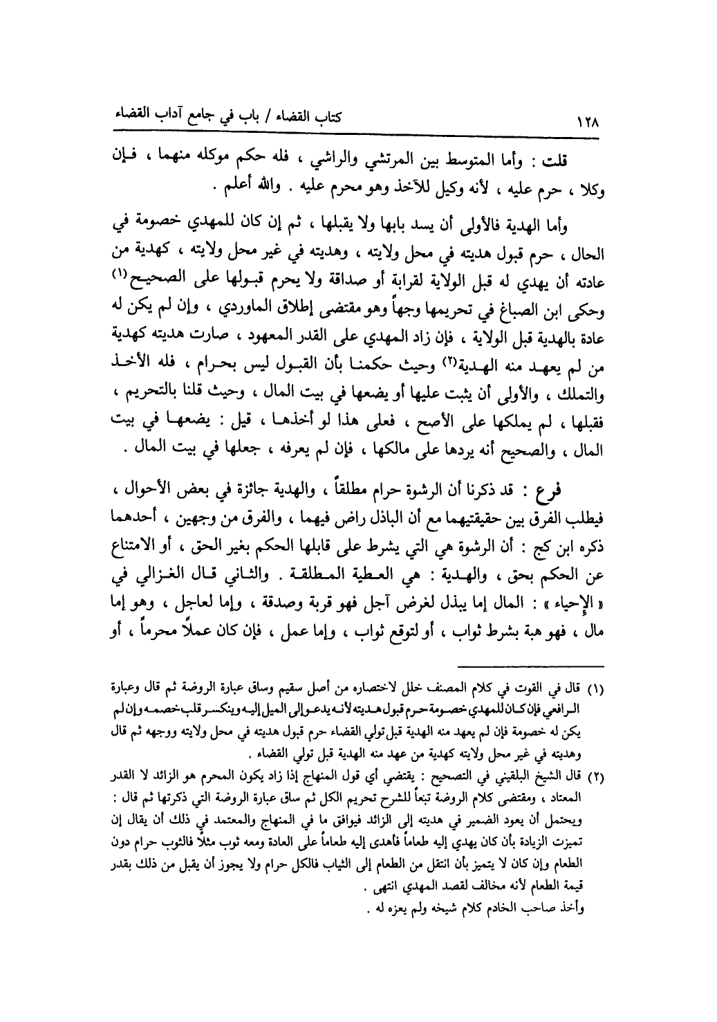 قلت: وأما المتوسط بين المرتشي والراشي، فله حكم موكله منهما، فإن وكلا، حرم عليه، لانه وكيل للآخذ وهو محرم عليه. والله أعلم. وأما الهدية فالاولى أن يسد بابها ولا يقبلها، ثم إن كان للمهدي خصومة في الحال، حرم قبول هديته في محل ولايته، وهديته في غير محل ولايته، كهدية من عادته أن يهدى له قبل الولاية لقرابة أو صداقة ولا يحرم قبولها على الصحيح، وحكى ابن الصباغ في تحريمها وجها وهو مقتضى إطلاق الماوردي، وإن لم يكن له عادة بالهدية قبل الولاية، فإن زاد المهدي على القدر المعهود، صارت هديته كهدية من لم يعهد منه الهدية، وحيث حكمنا بأن القبول ليس بحرام، فله الاخذ والتملك، والاولى أن يثبت عليها أو يضعها في بيت المال، وحيث قلنا بالتحريم، فقبلها، لم يملكها على الاصح، فعلى هذا لو أخذها، قيل: يضعها في بيت المال، والصحيح أنه يردها على مالكها، فإن لم يعرفه، جعلها في بيت المال. فرع قد ذكرنا أن الرشوة حرام مطلقا، والهدية جائزة في بعض الاحوال، فيطلب الفرق بين حقيقتيهما مع أن الباذل راض فيهما، والفرق من وجهين، أحدهما ذكره ابن كج: أن الرشوة هي التي يشرط على قابلها الحكم بغير الحق، أو الامتناع عن الحكم بحق، والهدية: هي العطية المطلقة. والثاني قال الغزالي في الاحياء: المال إما يبذل لغرض آجل فهو قربة وصدقة، وإما لعاجل، وهو إما مال، فهو هبة بشرط ثواب، أو لتوقع ثواب، وإما عمل، فإن كان عملا محرما، أو