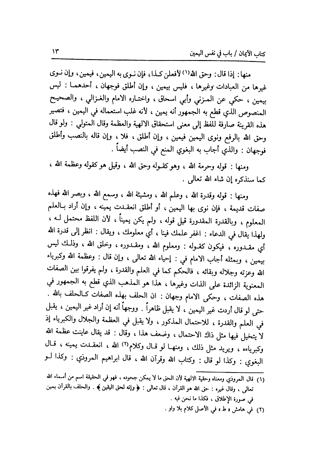 منها: إذا قال: وحق الله (1) لافعلن كذا، فإن نوى به اليمين، فيمين، وإن نوى غيرها من العبادات وغيرها، فليس بيمين، وإن أطلق فوجهان، أحدهما: ليس بيمين، حكي عن المزني وأبي اسحاق، واختاره الامام والغزالي، والصحيح المنصوص الذي قطع به الجمهور أنه يمين، لانه غلب استعماله في اليمين، فتصير هذه القرينة صارفه للفظ إلى معنى استحقاق الالهية والعظمة وقال المتولي: ولو قال وحق الله بالرفع ونوى اليمين فيمين، وإن أطلق، فلا، وإن قاله بالنصب وأطلق فوجهان: والذي أجاب به البغوي المنع في النصب أيضا. ومنها: قوله وحرمة الله، وهو كقوله وحق الله، وقيل هو كقوله وعظمة الله، كما سنذكره إن شاء الله تعالى. ومنها: قوله وقدرة الله، وعلم الله، ومشيئة الله، وسمع الله، وبصر الله فهذه صفات قديمة، فإن نوى بها اليمين، أو أطلق انعقدت يمينه، وإن أراد بالعلم المعلوم، وبالقدرة المقد ورة قيل قوله، ولم يكن يمينا، لان للفاظ محتمل له، ولهذا يقال في الدعاء: اغفر علمك فينا، أي معلومك، ويقال: انظر إلى قدرة الله أي مقدورة، فيكون كقوله: ومعلوم الله، ومقدوره، وخلق الله، وذلك ليس بيمين، وبمثله أجاب الامام في: إحياء الله تعالى، وإن قال: وعظمة الله وكبرياء الله وعزته وجلاله وبقائه، فالحكم كما في العلم والقدرة، ولم يفرقوا بين الصفات المعنوية الزائدة على الذات وغيرها، هذا هو المذهب الذي قطع به الجمهور في هذه الصفات، وحكى الامام وجهان: ان الحلف بهذه الصفات كالحلف بالله. حتى لو قال أردت غير اليمين، لا يقبل ظاهرا، ووجها أنه إن أراد غير اليمين، يقبل في العلم والقدرة، للاحتمال المذكور، ولا يقبل في العظمة والجلال والكبرياء إذ لا يتخيل فيها مثل ذلك الاحتمال، وضعف هذا، وقال: قد يقال عاينت عظمة الله وكبرياءه، ويريد مثل ذلك، ومنها لو قال وكلام (2) الله، انعقدت يمينه، قال البغوي: وكذ لو قال: وكتاب الله وقرآن الله، قال ابراهيم المروذي: وكذا لو
