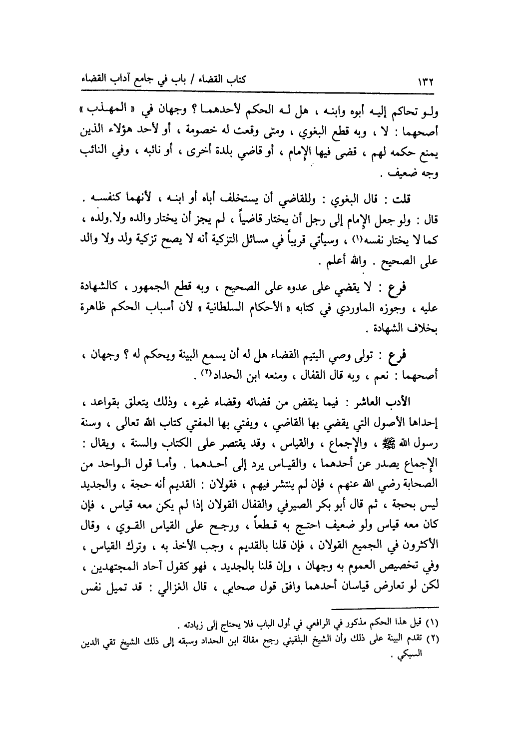 ولو تحاكم إليه أبوه وابنه، هل له الحكم لاحدهما ؟ وجهان في المهذب أصحهما: لا، وبه قطع البغوي. ومتى وقعت له خصومة، أو لاحد هؤلاء الذين يمنع حكمه لهم، قضى فيها الامام، أو قاضي بلدة أخرى، أو نائبه، وفي النائب وجه ضعيف. قلت: قال البغوي: وللقاضي أن يستخلف أباه أو ابنه، لانهما كنفسه. قال: ولو جعل الامام إلى رجل أن يختار قاضيا، لم يجز أن يختار والده ولا ولده، كما لا يختار نفسه، وسيأتي قريبا في مسائل التزكية أنه لا يصح تزكية ولد ولا والد على الصحيح. والله أعلم. فرع لا يقضي على عدوه على الصحيح، وبه قطع الجمهور، كالشهادة عليه، وجوزه الماوردي في كتابه الاحكام السلطانية لان أسباب الحكم ظاهرة بخلاف الشهادة. فرع تولى وصي اليتيم القضاء هل له أن يسمع البينة ويحكم له ؟ وجهان، أصحهما: نعم، وبه قال القفال، ومنعه ابن الحداد. الادب العاشر: فيما ينقض من قضائه وقضاء غيره، وذلك يتعلق بقواعد، إحداها الاصول التي يقضي بها القاضي، ويفتي بها المفتي كتاب الله تعالى، وسنة رسول الله - صلى الله عليه وسلم -، والاجماع، والقياس، وقد يقتصر على الكتاب والسنة، ويقال: الاجماع يصدر عن أحدهما، والقياس يرد إلى إحدهما. وأما قول الواحد من الصحابة رضي الله عنهم. فإن لم ينتشر فيهم، فقولان: القديم أنه حجة، والجديد ليس بحجة، ثم قال أبو بكر الصيرفي والقفال القولان إذا لم يكن معه قياس، فإن كان معه قياس ولو ضعيف احتج به قطعا، ورجح على القياس القوي، وقال الاكثرون في الجميع القولان، فإن قلنا بالقديم، وجب الاخذ به، وترك القياس، وفي تخصيص العموم به وجهان، وإن قلنا بالجديد، فهو كقول آحاد المجتهدين، لكن لو تعارض قياسان أحدهما وافق قول صحابي، قال الغزالي: قد تميل نفس