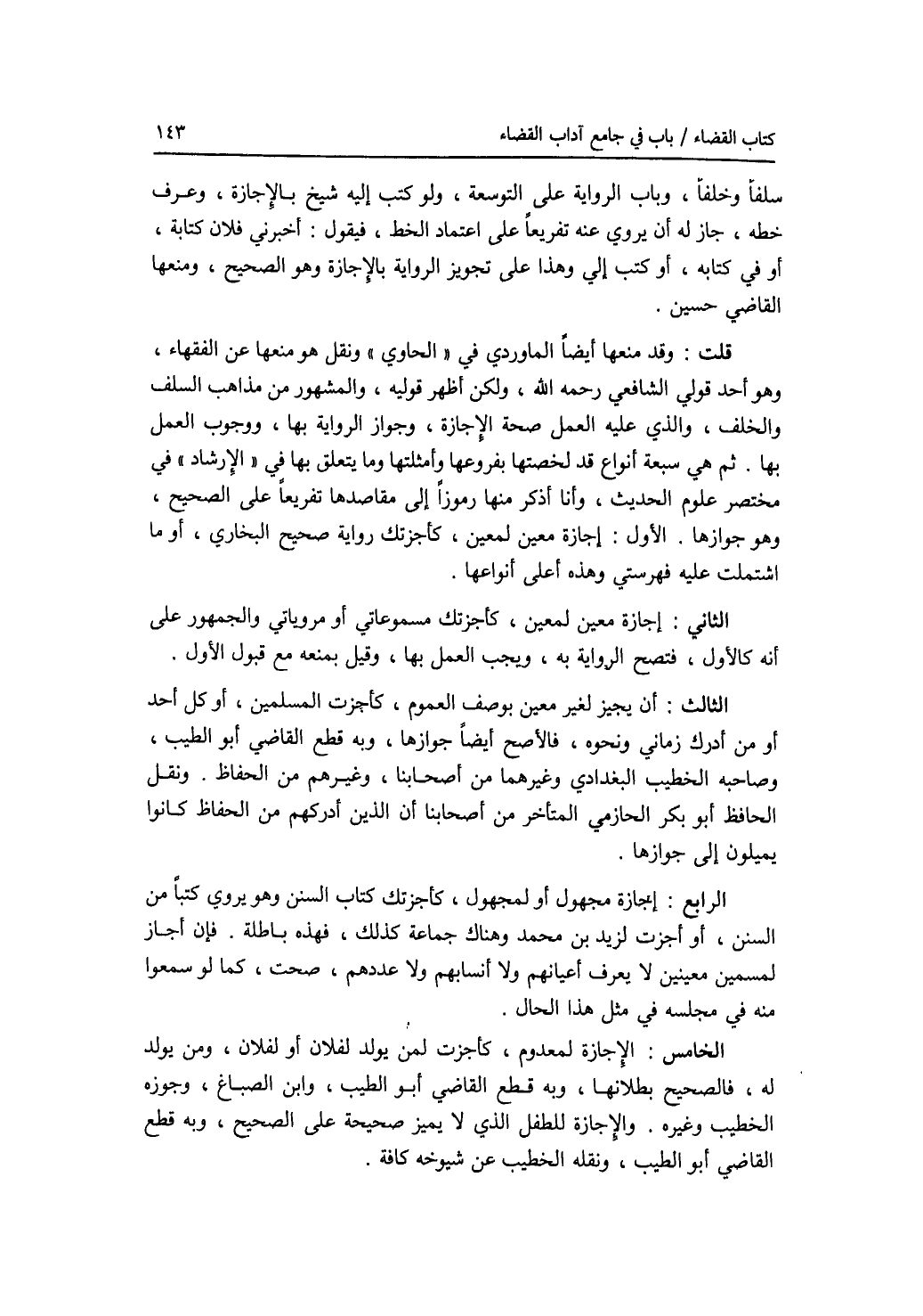 سلفا وخلفا، وباب الرواية على التوسعة، ولو كتب إليه شيخ بالاجازة، وعرف خطه، جاز له أن يروي عنه تفريعا على اعتماد الخط، فيقول: أخبرني فلان كتابة، أو في كتابة، أو كتب إلي وهذا على تجويز الرواية بالاجازة وهو الصحيح، ومنعها القاضي حسين. قلت: وقد منعها أيضا الماوردي في الحاوي ونقل هو منعها عن الفقهاء، وهو أحد قولي الشافعي رحمه الله، ولكن أظهر قوليه، والمشهور من مذاهب السلف والخلف، والذي عليه العمل صحة الاجازة، وجواز الرواية بها، ووجوب العمل بها. ثم هي سبعة أنواع قد لخصتها بفروعها وأمثلتها وما يتعلق بها في الارشاد في مختصر علوم الحديث، وأنا أذكر منها هنا رموزا إلى مقاصدها تفريعا على الصحيح، وهو جوازها. الاول: إجازة معين لمعين، كأجزتك رواية صحيح البخاري، أو ما اشتملت عليه فهرستي وهذه أعلى أنواعها. الثاني: إجازة غير معين لمعين، كأجزتك مسموعاتي أو مروياتي والجمهور على أنه كالاول، فتصح الرواية به، ويجب العمل بها، وقيل بمنعه مع قبول الاول. الثالث: أن يجيز لغير معين بوصف العموم، كأجزت المسلمين، أو كل أحد أو من أدرك زماني ونحوه، فالاصح أيضا جوازها، وبه قطع القاضي أبو الطيب، وصاحبه الخطيب البغدادي وغيرهما من أصحابنا، وغيرهم من الحفاظ. ونقل الحافظ أبو بكر الحازمي المتأخر من أصحابنا أن الذين أدركهم من الحفاظ كانوا يميلون إلى جوازها. الرابع: إجازة مجهول أو لمجهول، كأجرتك كتاب السنن وهو يروي كتبا من السنن، أ أجزت لزيد بن محمد وهناك جماعة كذلك، فهذه باطلة. فإن أجاز لمسمين معينين لايعرف أعيانهم ولا أنسابهم ولا عددهم، صحت، كما لو سمعوا منه في مجلسه في مثل هذا الحال. الخامس: الاجازة لمعدوم، كأجزت لمن يولد لفلان أو لفلان، ومن يولد له، فالصحيح بطلانها، وبه قطع القاضي أبو الطيب، وابن الصباغ، وجوزه الخطيب وغيره. والاجازة للطفل الذي لا يميز صحيحة على الصحيح، وبه قطع القاضي أبو الطيب، ونقله الخطيب عن شيوخه كافة.