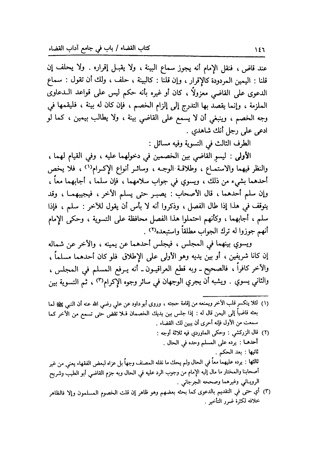 الطرف الثالث : في التسوية وفيه مسائل: الاولى: ليسو القاضي بين الخصمين في دخولهما عليه، وفي القيام لهما، والنظر فيهما والاستماع، وطلاقة الوجه، وسائر أنواع الاكرام، فلا يخص أحدهما بشئ من ذلك، ويسوي في جواب سلامهما، فإن سلما، أجابهما معا، وإن سلم أحدهما، قال الاصحاب: يصبر حتى يسلم الآخر، فيجيبهما: وقد يتوقف في هذا إذا طال الفصل، وذكروا أنه لا بأس أن يقول للآخر: سلم، فإذا سلم، أجابهما، وكأنهم احتملوا هذا الفصل محافظة على التسوية، وحكى الامام أنهم جوزوا له ترك الجواب مطلقا واستبعده. ويسوي بينهما في المجلس، فيجلس أحدهما عن يمينه، والآخر عن شماله إن كانا شريفين، أو بين يديه وهو الاولى على الاطلاق، فلو كان أحدهما مسلما والآخر كافرا، فالصحيح - وبه قطع العراقيون - أنه يرفع المسلم في المجلس، والثاني يسوي. ويشبه أن يجري الوجهان في سائر وجوه الاكرام، ثم التسوية بين