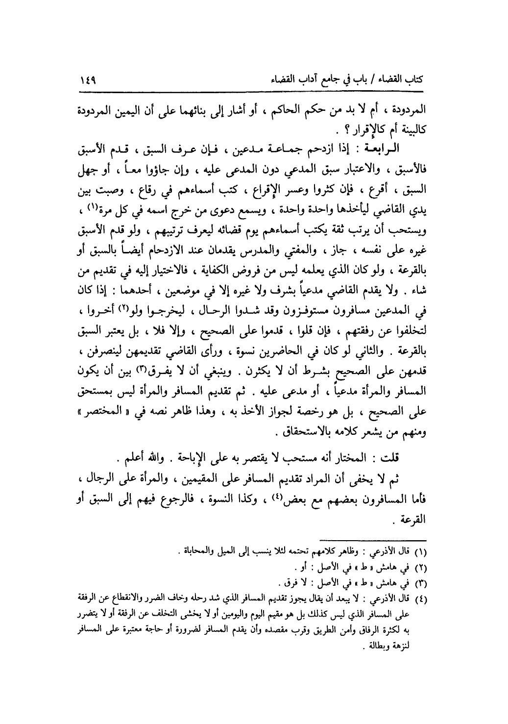 المردودة، أم لا بد من حكم الحاكم، أو أشار إلى بنائهما على أن اليمين المردودة كالبينة أم كالاقرار ؟. الرابعة: إذا ازدحم جماعة مدعين، فإن عرف السبق، قدم الاسبق فالاسبق، والاعتبار سبق المدعي دون المدعى عليه، وإن جاؤوا معا، أو جهل السبق، أقرع، فإن كثروا وعسر الاقراع، كتب أسماءهم في رقاع، وصبت بين يدي القاضي ليأخذها واحدة واحدة، ويسمع دعوى من خرج اسمه في كل مرة، ويستحب أن يرتب ثقة يكتب أسماءه يوم قضائه ليعرف ترتيبهم، ولو قدم الاسبق غيره على نفسه، جاز، والمفتي والمدرس يقدمان عند الازدحام أيضا بالسبق أو بالقرعة، ولو كان الذي يعلمه ليس من فروض الكفاية، فالاختيار إليه في تقديم من شاء. ولا يقدم القاضي مدعيا بشرف ولا غيره إلا في موضعين، أحدهما: إذا كان في المدعين مسافرون مستوفزون وقد شدوا الرحال، ليخرجوا ولو أخروا، لتخلفوا عن رفقتهم، فإن قلوا، قدموا على الصحيح، وإلا فلا، بل يعتبر السبق بالقرعة. والثاني لو كان في الحاضرين نسوة، ورأى القاضي تقديمهن لينصرفن، قدمهن على الصحيح بشرط أن لا يكثرن. وينبغي أن لا يفرق بين أن يكون المسافر والمرأة مدعيا، أو مدعى عليه. ثم تقديم المسافر والمرأة ليس بمستحق على الصحيح، بل هو رخصة لجواز الاخذ به، وهذا ظاهر نصه في المختصر ومنهم من يشعر كلامه بالاستحقاق. قلت: المختار أنه مستحب لا يقتصر به على الاباحة. والله أعلم. ثم لا يخفى أن المراد تقديم المسافر على المقيمين، والمرأة على الرجال، فأما المسافرون بعضهم مع بعض، وكذا النسوة، فالرجوع فيهم إلى السبق أو القرعة.