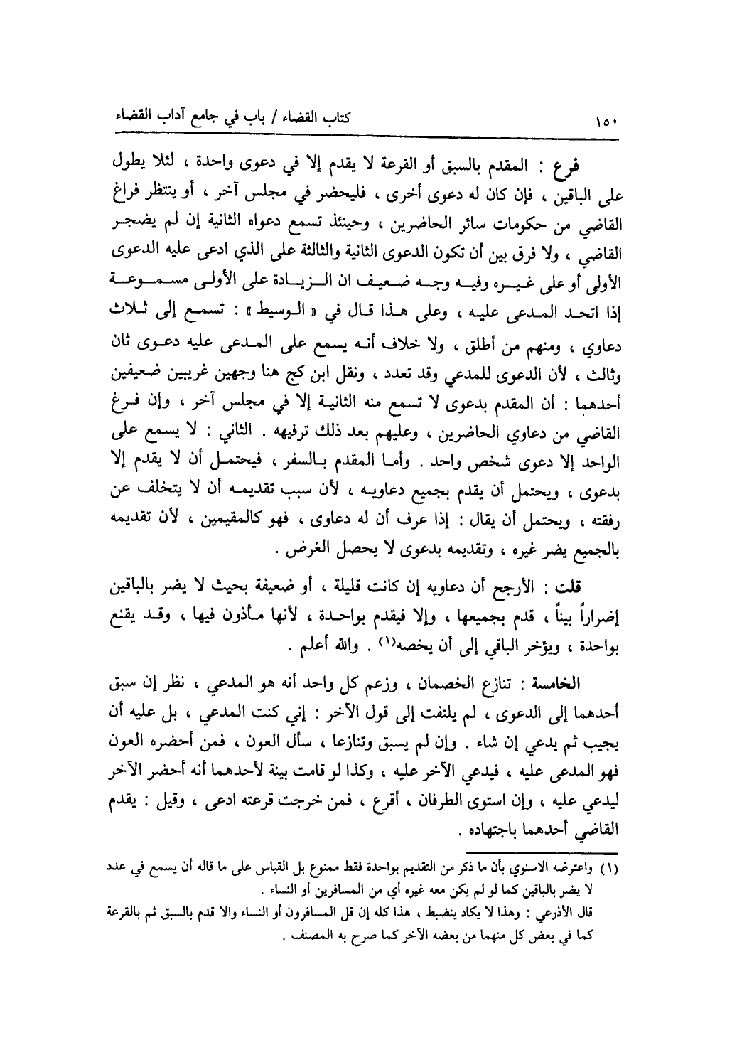 فرع المقدم بالسبق أو القرعة لا يقدم إلا في دعوى واحدة، لئلا يطول على الباقين، فإن كان له دعوى أخرى، فليحضر في مجلس آخر، أو ينتظر فراغ القاضي من حكومات سائر الحاضرين، وحينئذ تسمع دعواه الثانية إن لم يضجر القاضي، ولا فرق بين أن تكون الدعوى الثانية والثالثة على الذي ادعى عليه الدعوى الاولى أو على غيره، وفيه وجه ضعيف أن الزيادة على الاولى مسموعة إذا اتحد المدعى عليه، وعلى هذا قال في الوسيط: تسمع إلى ثلاث دعاوى، ومنهم من أطلق، ولا خلاف أنه يسمع على المدعى عليه دعوى ثان وثالث، لان الدعوى للمدعي وقد تعدد، ونقل ابن كج هنا وجهين غريبين ضعيفين أحدهما: أن المقدم بدعوى لا تسمع منه الثانية إلا في مجلس آخر، وإن فرغ القاضي من دعاوي الحاضرين، وعليهم بعد ذلك ترفيهه. الثاني: لا يسمع على الواحد إلا دعوى شخص واحد. وأما المقدم بالسفر، فيحتمل أن لا يقدم إلا بدعوى، ويحتمل أن يقدم بجميع دعاويه، لان سبب تقديمه أن لا يتخلف عن رفقته، ويحتمل أن يقال: إذا عرف أن له دعاوى، فهو كالمقيمين، لان تقديمه بالجميع يضر غيره، وتقديمه بدعوى لا يحصل الغرض. قلت: الارجح أن دعاويه إن كانت قليلة، أو ضعيفة بحيث لا يضر بالباقين إضرارا بينا، قدم بجميعها، وإلا فيقدم بواحدة، لانها مأذون فيها، وقد يقنع بواحدة، ويؤخر الباقي إلى أن يخصه. والله أعلم. الخامسة: تنازع الخصمان، وزعم كل واحد أنه هو المدعي، نظر إن سبق أحدهما إلى الدعوى، لم يلتفت إلى قول الآخر: إني كنت المدعي، بل عليه أن يجيب ثم يدعي إن شاء. وإن لم يسبق وتنازعا، سأل العون، فمن أحضره العون فهو المدعى عليه، فيدعي الآخر عليه، وكذا لو قامت بينة لاحدهما أنه أحضر الآخر ليدعي عليه، وإن استوى الطرفان، أقرع، فمن خرجت قرعته ادعى، وقيل: يقدم القاضي أحدهما باجتهاده.