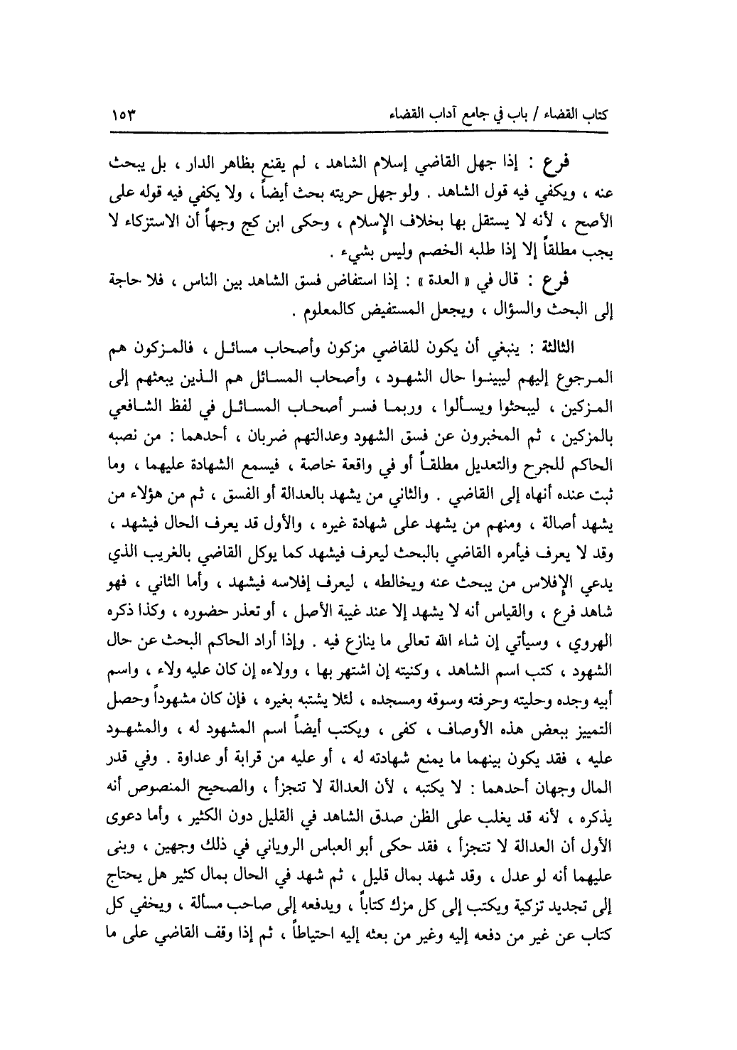 فرع إذا جهل القاضي إسلام الشاهد، لم يقنع بظاهر الدار، بل يبحث عنه، ويكفي فيه قول الشاهد. ولو جهل حريته بحث أيضا، ولا يكفي فيه قوله على الاصح، لانه لا يستقل بها بخلاف الاسلام، وحكى ابن كج وجها أن الاستزكاء لا يجب مطلقا إلا إذا طلبه الخصم وليس بشئ. فرع قال في العدة: إذا استفاض فسق الشاهد بين الناس، فلا حاجة إلى البحث والسؤال، ويجعل المستفيض كالمعلوم. الثالثة: ينبغي أن يكون للقاضي مزكون وأصحاب مسائل، فالمزكون هم المرجوع إليهم ليبينوا حال الشهود، وأصحاب المسائل هم الذين يبعثهم إلى المزكين، ليبحثوا ويسألوا، وربما فسر أصحاب المسائل في لفظ الشافعي بالمزكين، ثم المخبرون عن فسق الشهود وعدالتهم ضربان، أحدهما: من نصبه الحاكم للجرح والتعديل مطلقا أو في واقعة خاصة، فيسمع الشهادة عليهما، وما ثبت عنده أنهاه إلى القاضي. والثاني من يشهد بالعدالة أو الفسق، ثم من هؤلاء من يشهد أصالة، ومنهم من يشهد على شهادة غيره، والاول قد يعرف الحال فيشهد، وقد لا يعرف فيأمره القاضي بالبحث ليعرف فيشهد كما يوكل القاضي بالغريب الذي يدعي الافلاس من يبحث عنه ويخالطه، ليعرف إفلاسه فيشهد، وأما الثاني، فهو شاهد فرع، والقياس أنه لا يشهد إلا عند غيبة الاصل، أو تعذر حضوره، وكذا ذكره الهروي، وسيأتي إن شاء الله تعالى ما ينازع فيه. وإذا أراد الحاكم البحث عن حال الشهود، كتب اسم الشاهد، وكنيته إن اشتهر بها، وولاءه إن كان عليه ولاء، واسم أبيه وجده وحليته وحرفته وسوقه ومسجده، لئلا يشتبه بغيره، فإن كان مشهودا وحصل التمييز ببعض هذه الاوصاف، كفى، ويكتب أيضا اسم المشهود له، والمشهود عليه، فقد يكون بينهما ما يمنع شهادته له، أو عليه من قرابة أو عداوة. وفي قدر المال وجهان أحدهما: لا يكتبه، لانه العدالة لا تتجزأ، والصحيح المنصوص أنه يذكره، لانه قد يغلب على الظن صدق الشاهد في القليل دون الكثير، وأما دعوى الاول أن العدالة لا تتجزأ، فقد حكى أبو العباس الروياني في ذلك وجهين وبنى عليهما أنه لو عدل، وقد شهد بمال قليل، ثم شهد في الحال بمال كثير هل يحتاج إلى تجديد تزكية ويكتب إلى كل مزك كتابا، ويدفعه إلى صاحب مسألة، ويخفي كل كتاب عن غير من دفعه إليه وغير من بعثه إليه احتياطا، ثم إذا وقف القاضي على ما