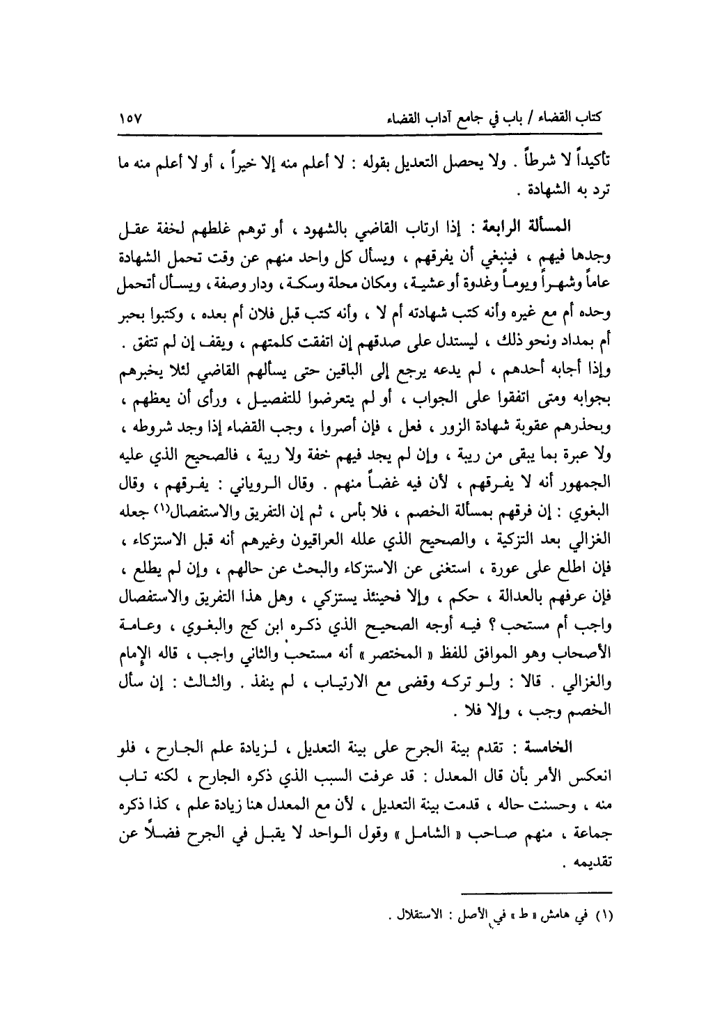 تأكيدا لا شرطا. ولا يحصل التعديل بقوله: لا أعلم منه إلا خيرا، أو لا أعلم منه ما ترد به الشهادة. المسألة الرابعة: إذا ارتاب القاضي بالشهود، أو توهم غلطهم لخفة عقل وجدها فيهم، فينبغي أن يفرقهم، ويسأل كل واحد منهم عن وقت تحمل الشهادة عاما وشهرا ويوما وغدوة أو عشية، ومكان محلة وسكة، ودار وصفة، ويسأل أتحمل وحده أم مع غيره وأنه كتب شهادته أم لا، وأنه كتب قبل فلان أم بعده، وكتبوا بحبر أم بمداد ونحو ذلك، ليستدل على صدقهم إن اتفقت كلمتهم، ويقف إن لم تتفق. وإذا أجابه أحدهم، لم يدعه يرجع إلى الباقين حتى يسألهم القاضي لئلا يخبرهم بجوابه ومتى اتفقوا على الجواب، أو لم يتعرضوا للتفصيل، ورأى أن يعظهم، ويحذرهم عقوبة شهادة الزور، فعل، فإن أصروا، وجب القضاء إذا وجد شروطه، ولا عبرة بما يبقى من ريبة، وإن لم يجد فيهم خفة ولا ريبة، فالصحيح الذي عليه الجمهور أنه لا يفرقهم، لان فيه غضا منهم. وقال الروياني: يفرقهم، وقال البغوي: إن فرقهم، بمسألة الخصم، فلا بأس، ثم إن التفريق والاستفصال جعله الغزالي بعد التزكية، والصحيح الذي علله العراقيون وغيرهم أنه قبل الاستزكاء، فإن اطلع على عورة، استغنى عن الاستزكاء والبحث عن حالهم، وإن لم يطلع، فإن عرفهم بالعدالة، حكم، وإلا فحينئذ يستزكي، وهل هذا التفريق والاستفصال واجب أم مستحب ؟ فيه أوجه الصحيح الذي ذكره ابن كج والبغوي، وعامة الاصحاب وهو الموافق للفظ المختصر أنه مستحب والثاني واجب، قاله الامام والغزالي. قالا: ولو تركه وقضى مع الارتياب، لم ينفذ. والثالث: إن سأل الخصم وجب، وإلا فلا. الخامسة: تقدم بينة الجرح على بينة التعديل، لزيادة علم الجارح، فلو انعكس الامر بأن قال المعدل: قد عرفت السبب الذي ذكره الجارح، لكنه تاب منه، وحسنت حاله، قدمت بينة التعديل، لان مع المعدل هنا زيادة علم، كذا ذكره جماعة، منهم صاحب الشامل وقول الواحد لا يقبل في الجرح فضلا عن تقديمه.