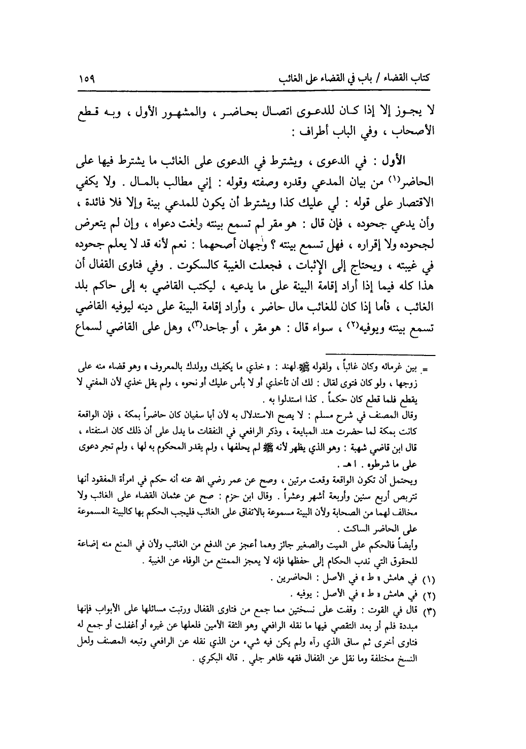 الأول : في الدعوى، ويشترط في الدعوى على الغائب ما يشترط فيها على الحاضر من بيان المدعى وقدره وصفته وقوله: إني مطالب بالمال. ولا يكفي الاقتصار على قوله: لي عليك كذا ويشترط أن يكون للمدعي بينة وإلا فلا فائدة، وأن يدعي جحوده، فإن قال: هو مقر لم تسمع بينته ولغت دعواه، وإن لم يتعرض لجحوده ولا إقراره، فهل تسمع بينته ؟ وجهان أصحهما: نعم لانه قد لا يعلم جحوده في غيبته، ويحتاج إلى الاثبات، فجعلت الغيبة كالسكوت. وفي فتاوي القفال أن هذا كله فيما إذا أراد إقامة البينة على ما يدعيه، ليكتب القاضي به إلى حاكم بلد الغائب، فأما إذا كان للغائب مال حاضر، وأراد إقامة البينة على دينه ليوفيه القاضي تسمع بينته ويوفيه، سواء قال: هو مقر، أو جاحد، وهل على القاضي لسماع