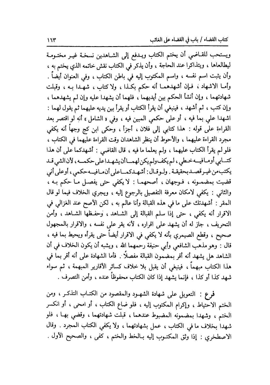 ويستحب للقاضي أن يختم الكتاب ويدفع إلى الشاهدين نسخة غير مختومة ليطالعاها، ويتذاكرا عند الحاجة، وأن يذكر في الكتاب نقش خاتمه الذي يختم به، وأن يثبت اسم نفسه، واسم المكتوب إليه في باطن الكتاب، وفي العنوان أيضا. وأما الاشهاد، فإن أشهدهما أنه حكم بكذا، ولا كتاب، شهدا به، وقبلت شهادتهما، وإن أنشأ الحكم بين أيديهما، فلهما أن يشهدا عليه وإن لم يشهدهما، وإن كتب، ثم أشهد، فينبغي أن يقرأ الكتاب أو يقرأ بين يديه عليهما ثم يقول لهما: إشهدا علي بما فيه، أو على حكمي المبين فيه، وفي الشامل أنه لو اقتصر بعد القراء على قوله: هذا كتابي إلى فلان، أجزأ، وحكى ابن كج وجها أنه يكفي مجرد القراءة عليهما، والاحوط أن ينظر الشاهدان وقت القراءة عليهما في الكتاب، فلو لم يقرأ الكتاب عليهما، ولم يعلما ما فيه، قال القاضي: أشهدكما على أن هذا كتابي أو ما فيه خطي، لم يكف، ولم يكن لهما أن يشهدا على حكمه، لان الشئ قد يكتب من غير قصد بحقيقة. ولو قال: أشهدكما على أن ما فيه حكمي، أو على أني قضيت بمضمونه، فوجهان، أصحهما: لا يكفي حتى يفصل ما حكم به، والثاني: يكفي لامكان معرفة التفصيل بالرجوع إليه، ويجري الخلاف فيما لو قال المقر: أشهدتك على ما في هذه القبالة وأنا عالم به، لكن الاصح عند الغزالي في الاقرار أنه يكفي، حتى إذا سلم القبالة إلى الشاهد، وحفظها الشاهد، وأمن التحريف، جاز له أن يشهد على إقراره، لانه يقر على نفسه، والاقرار بالمجهول صحيح، وقطع الصيمري بأنه لا يكفي في الاقرار أيضا حتى يقرأه ويحيط بما فيه، قال: وهو مذهب الشافعي وأبي حنيفة رحمهما الله، ويشبه أن يكون الخلاف في أن الشاهد هل يشهد أنه أقر بمضمون القبالة مفصلا. فأما الشهادة على أنه أقر بما في هذا الكتاب مبهما، فينبغي أن يقبل بلا خلاف كسائر الاقارير المبهمة، ثم سواء شهد كذا أو كذا، فإنما يشهد إذا كان الكتاب محفوظا عنده، وأمن التصرف. فرع التعويل على شهادة الشهود والمقصود من الكتاب التذكر، ومن الختم الاحتياط، وإكرام المكتوب إليه، فلو ضاع الكتاب، أو امحى، أو انكسر الختم، وشهدا بمضمونه المضبوط عندهما، قبلت شهادتهما، وقضي بها، فلو شهدا بخلاف ما في الكتاب، عمل بشهادتهما، ولا يكفي الكتاب المجرد. وقال الاصطخري: إذا وثق المكتوب إليه بالخط والختم، كفى، والصحيح الاول.